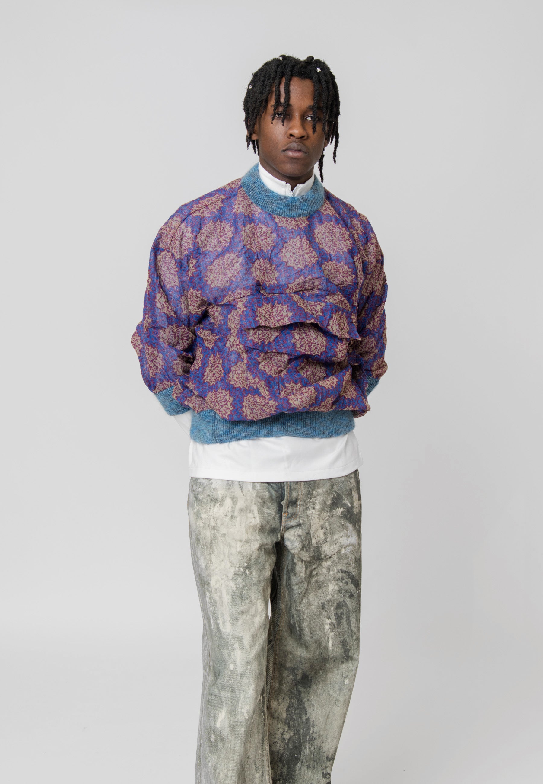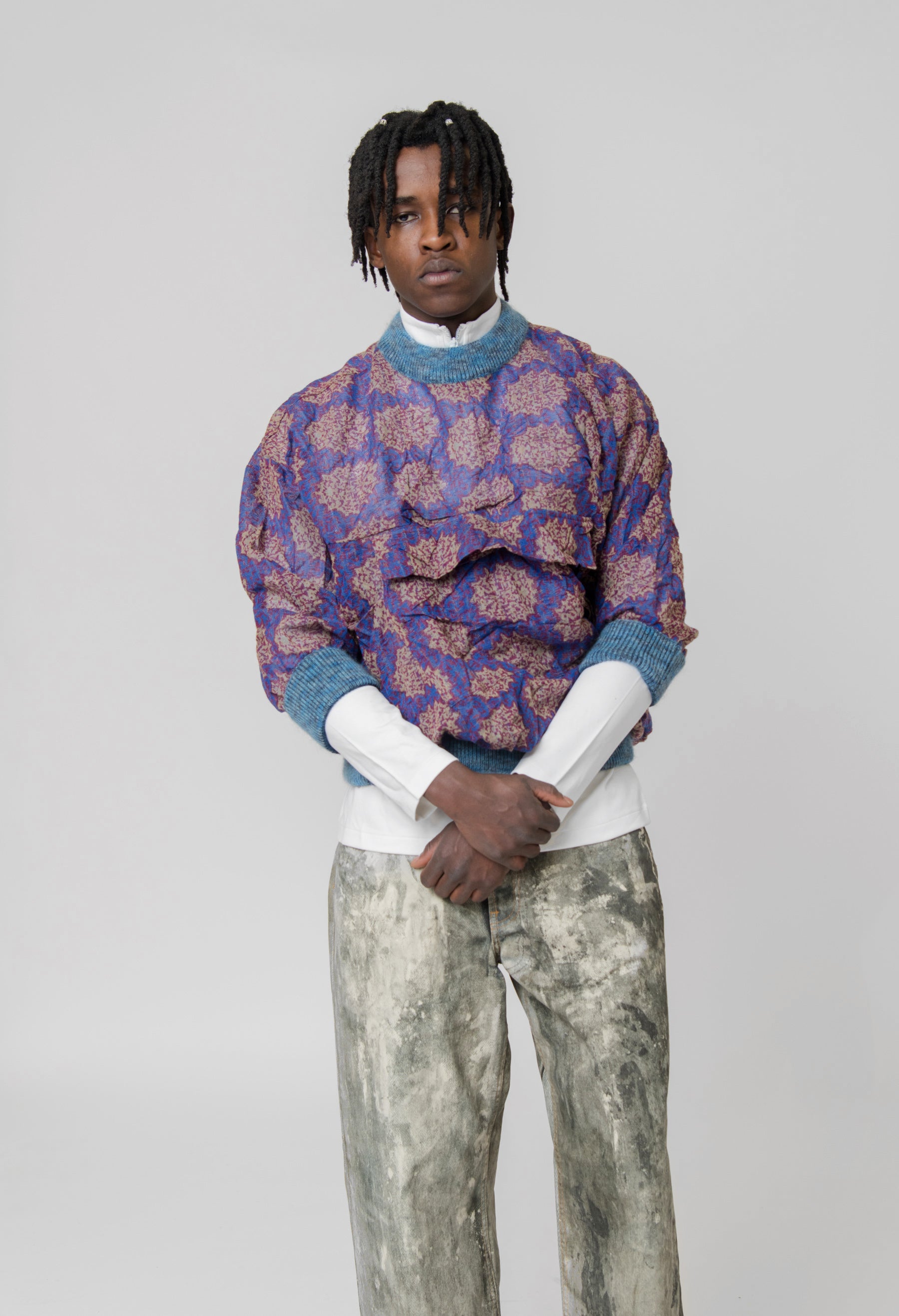 - Finely knit jacquard crinkled and gathered sweater in Blue and Burgundy
