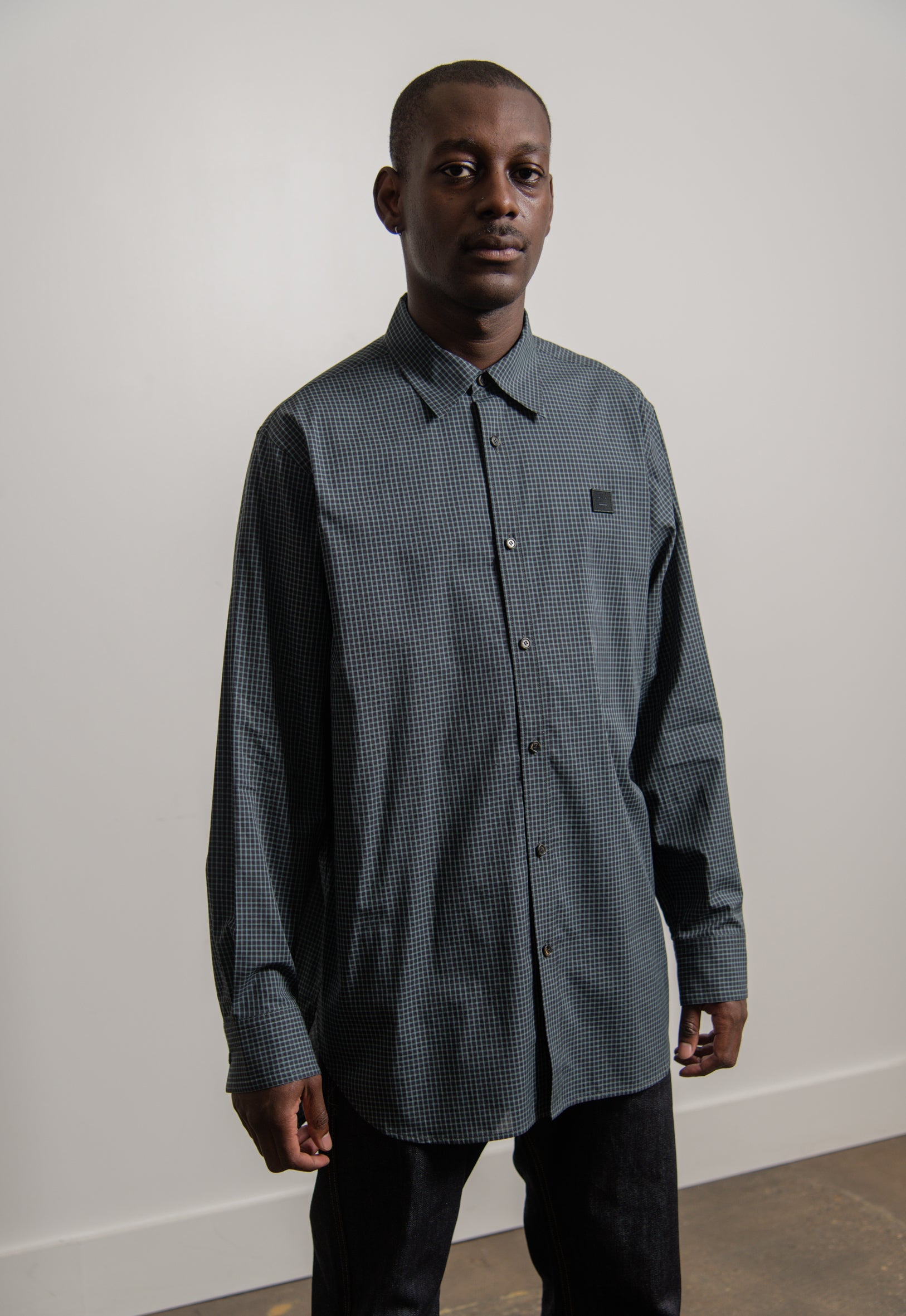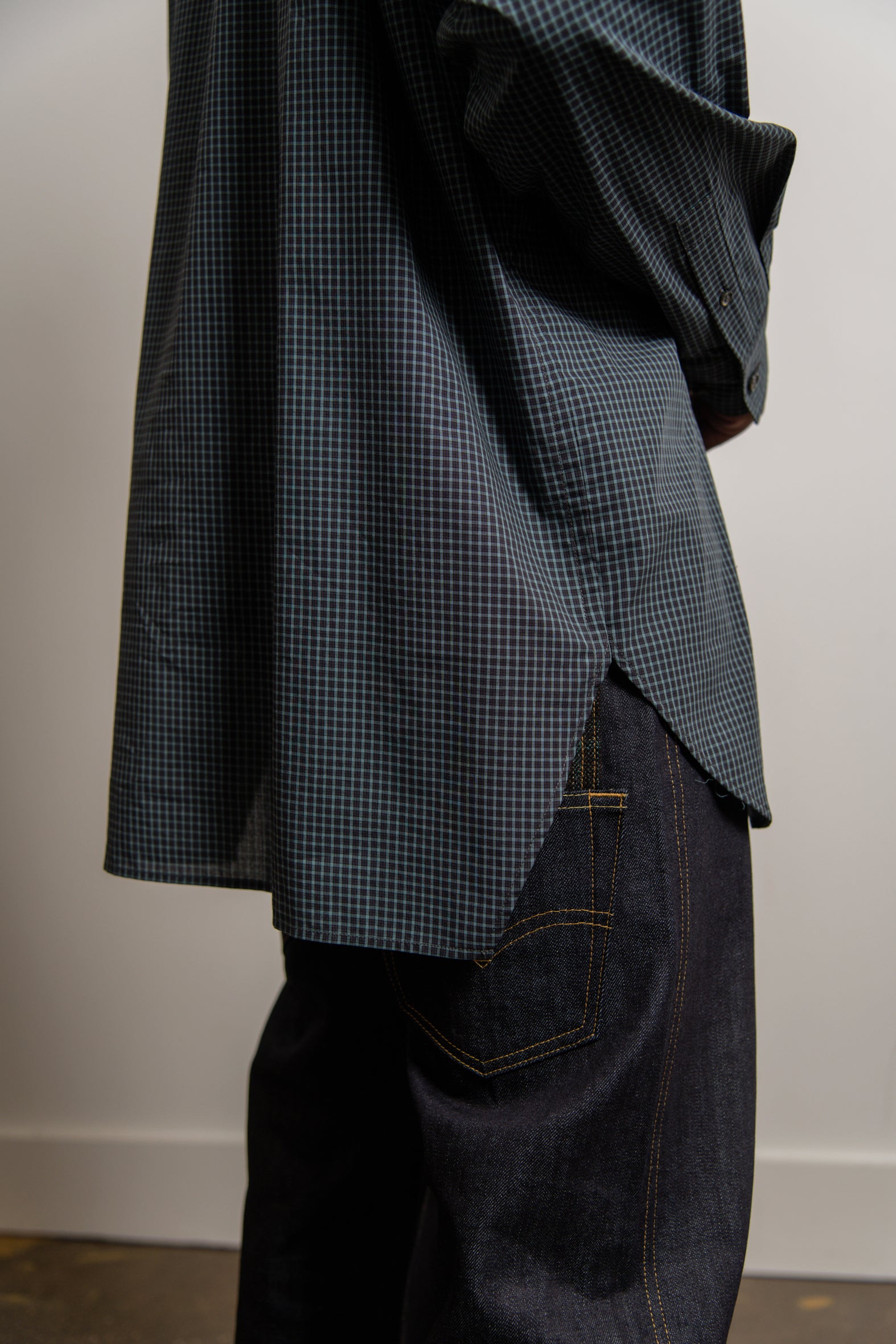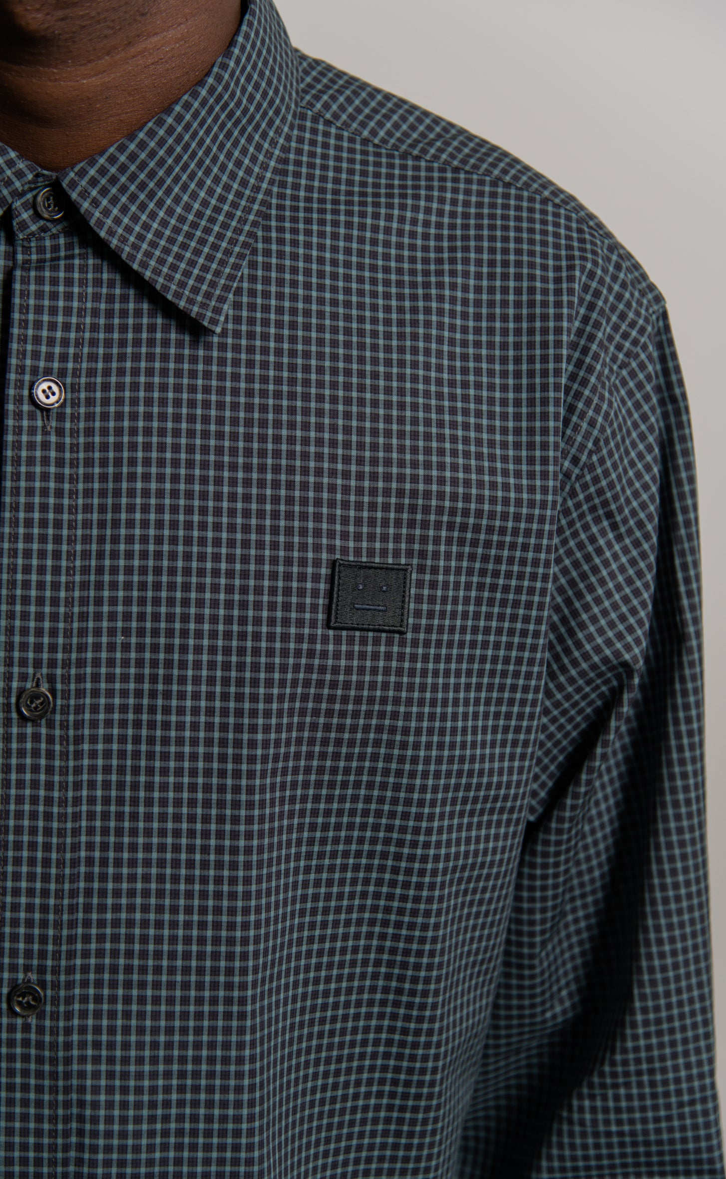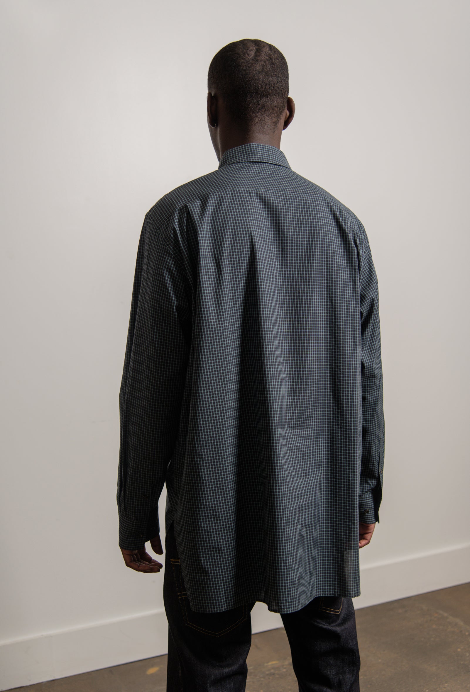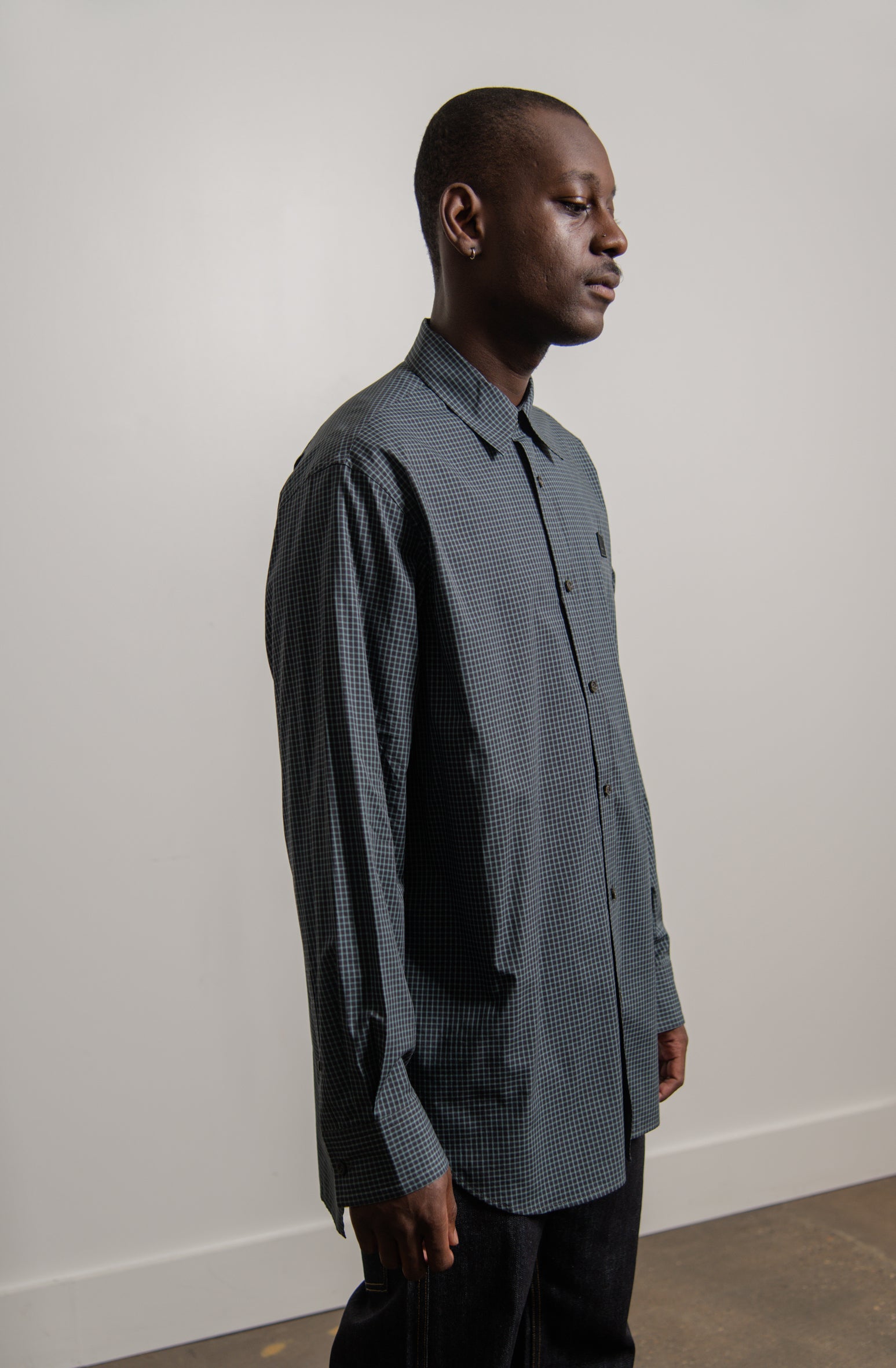 - Long sleeve organic cotton button-up shirt in Navy Blue Check