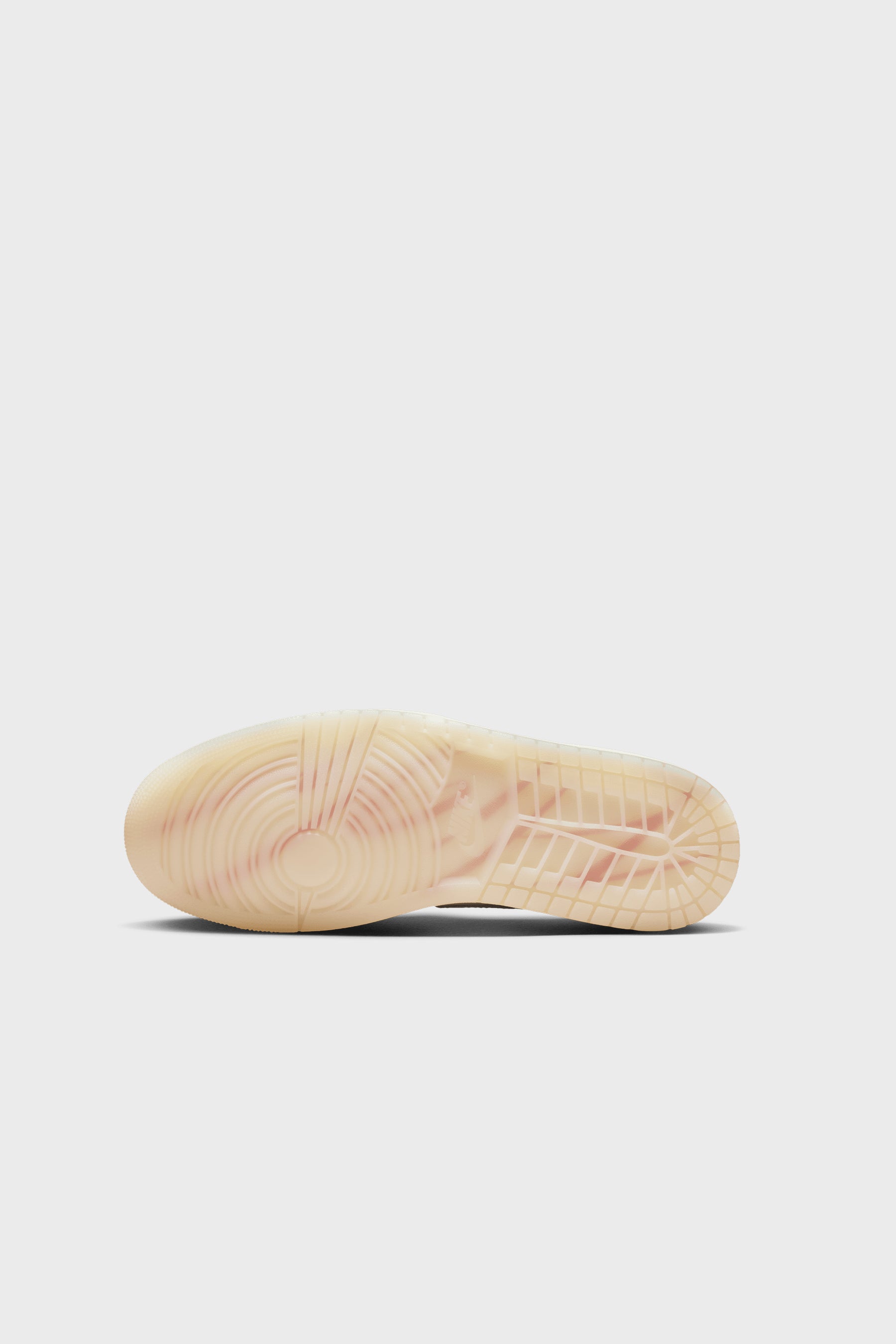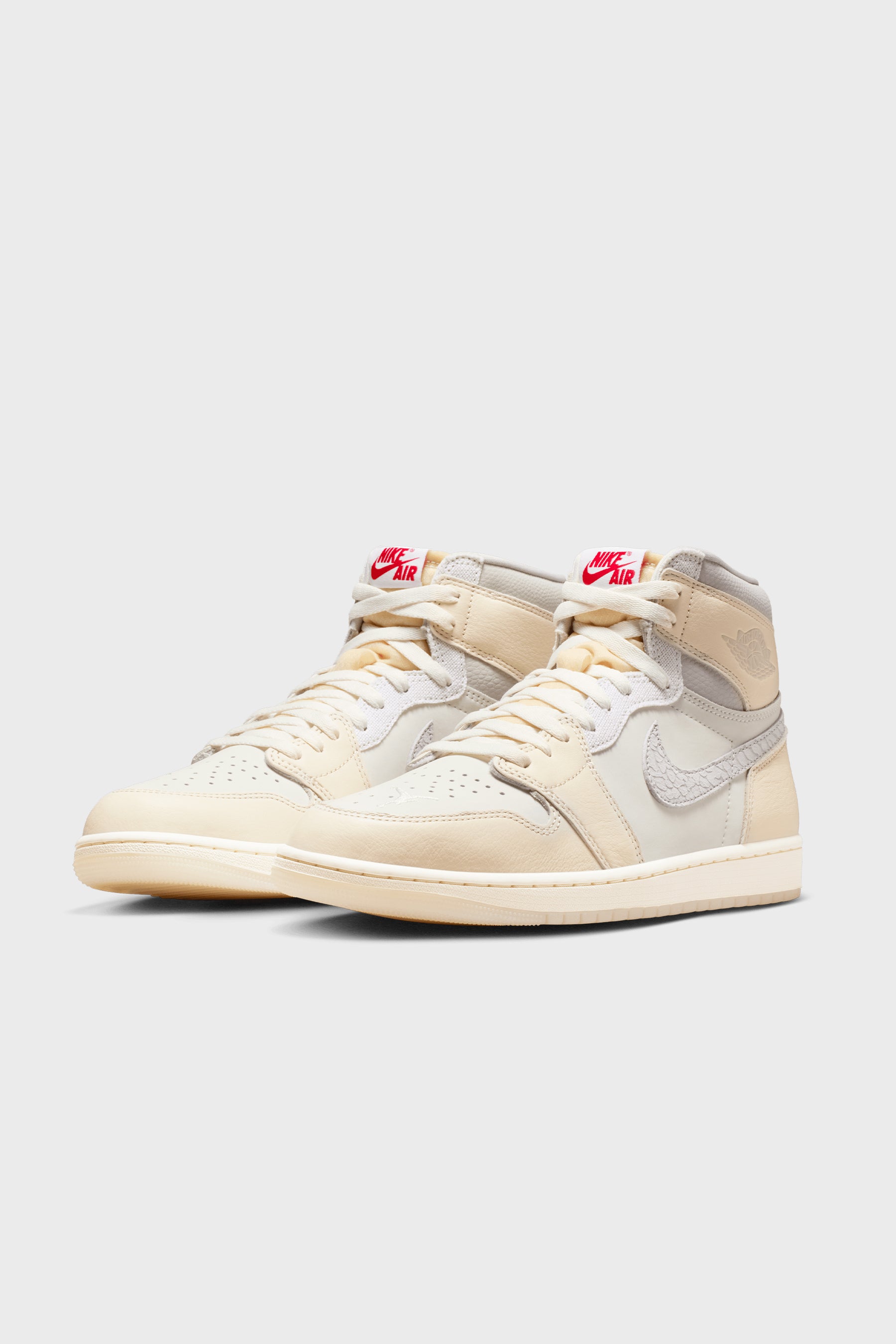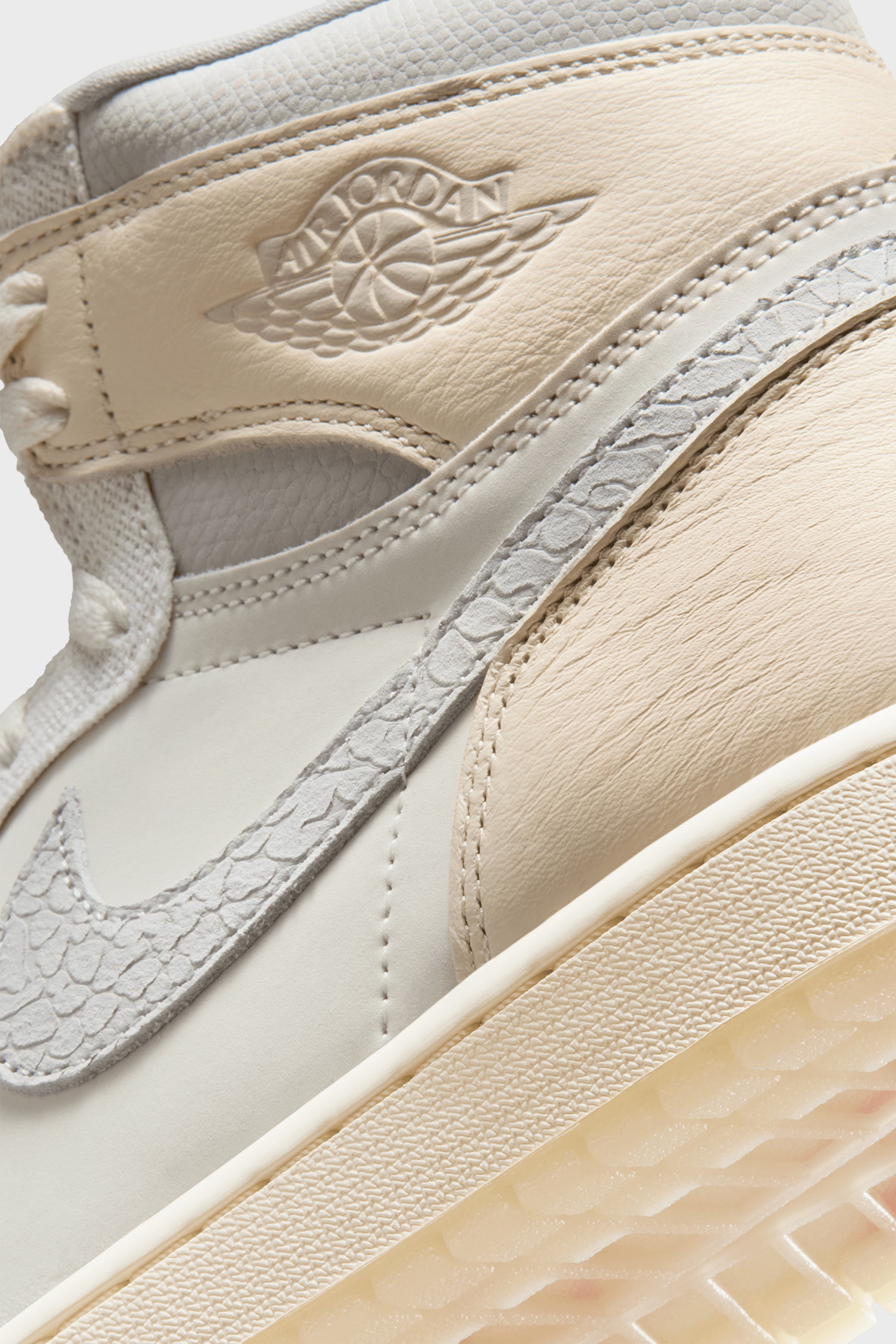 The Air Jordan 1 High “Sail” fuses minimalist design with bold heritage details, featuring AJ3 elephant print on the Swoosh, red contrast stitching, and a translucent outsole stamped with the Flight logo.