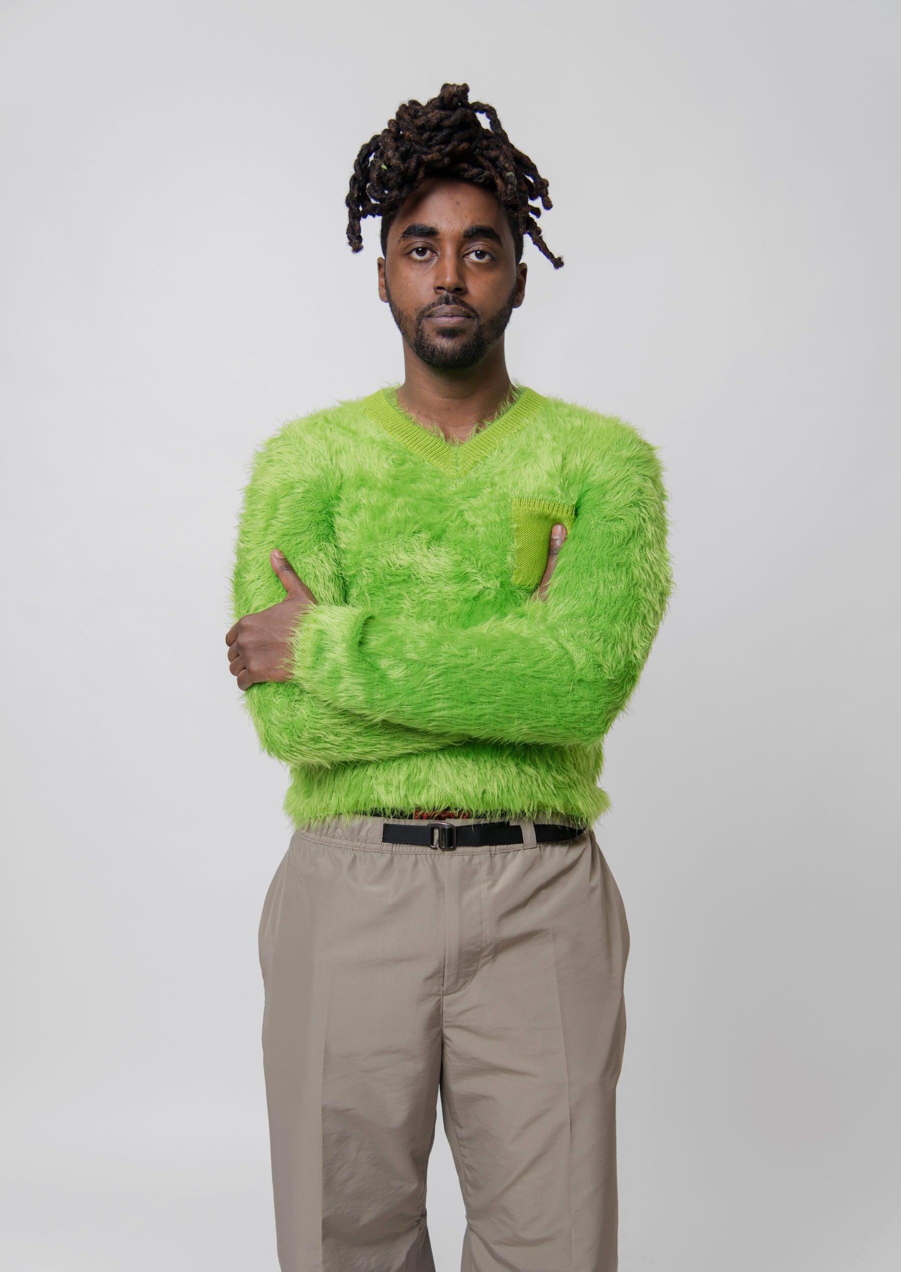 Acne Studios apple green v-neck jumper features a fluffy textured finish, detailed with a cotton chest pocket. Cut to a fitted fit with a cropped length.