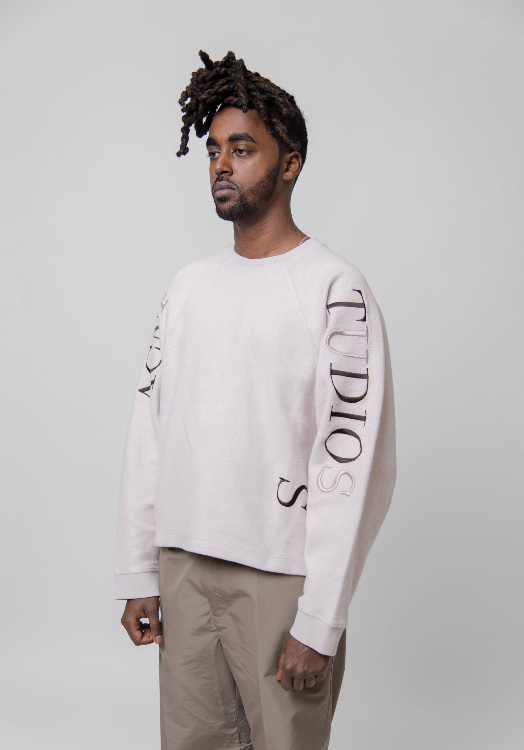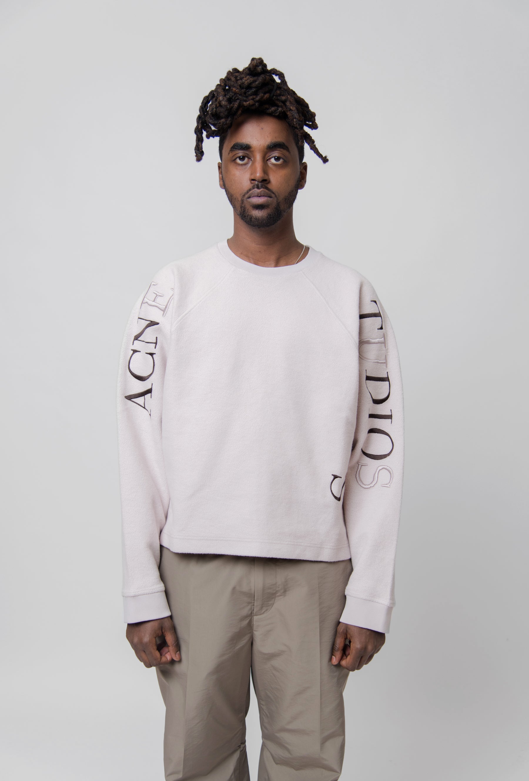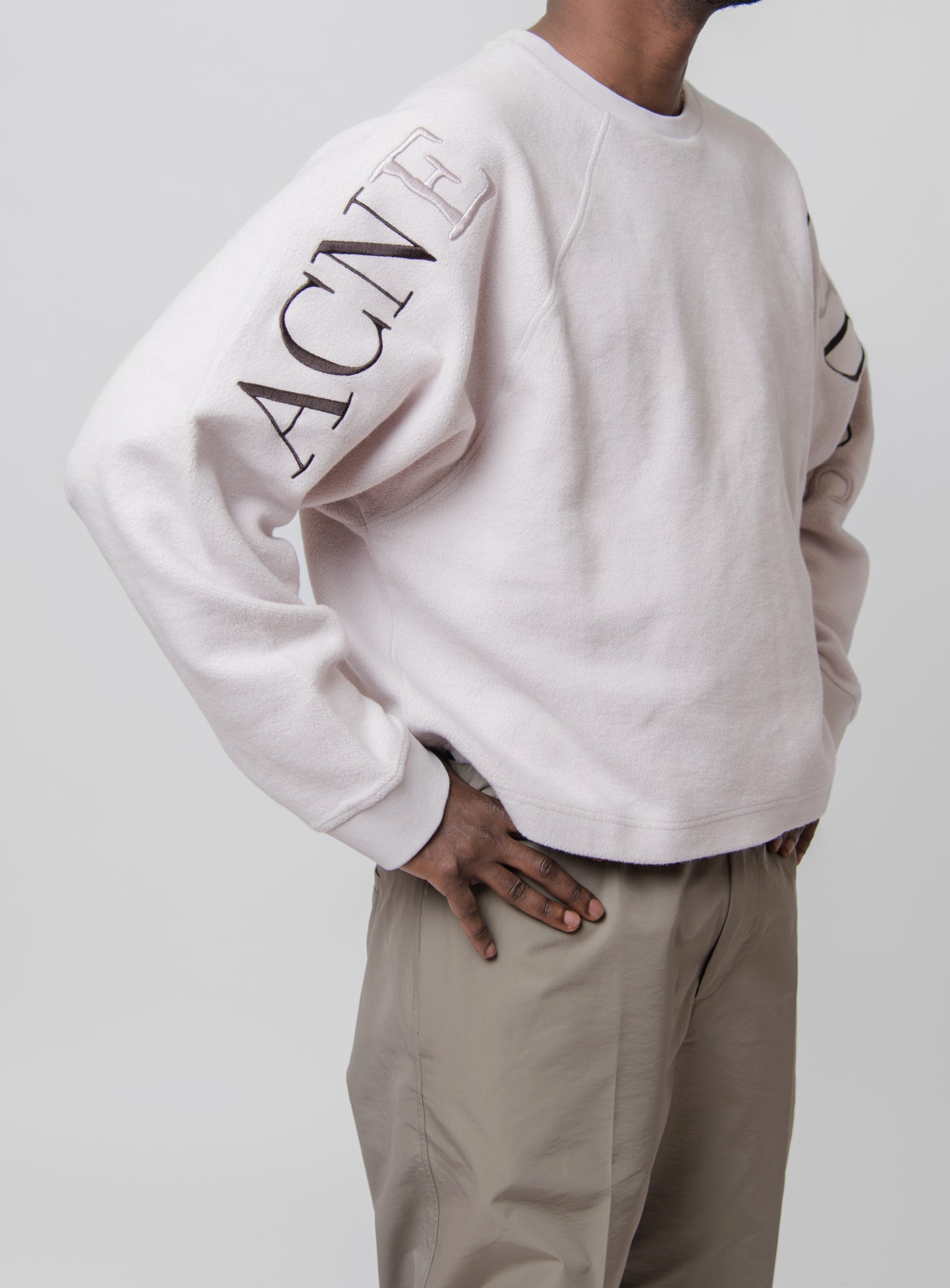 Acne Studios pale lilac sweatshirt features an embroidered Acne Studios logo with wavy typography, crafted from brushed fleece cotton. Cut to a relaxed fit and a regular length.