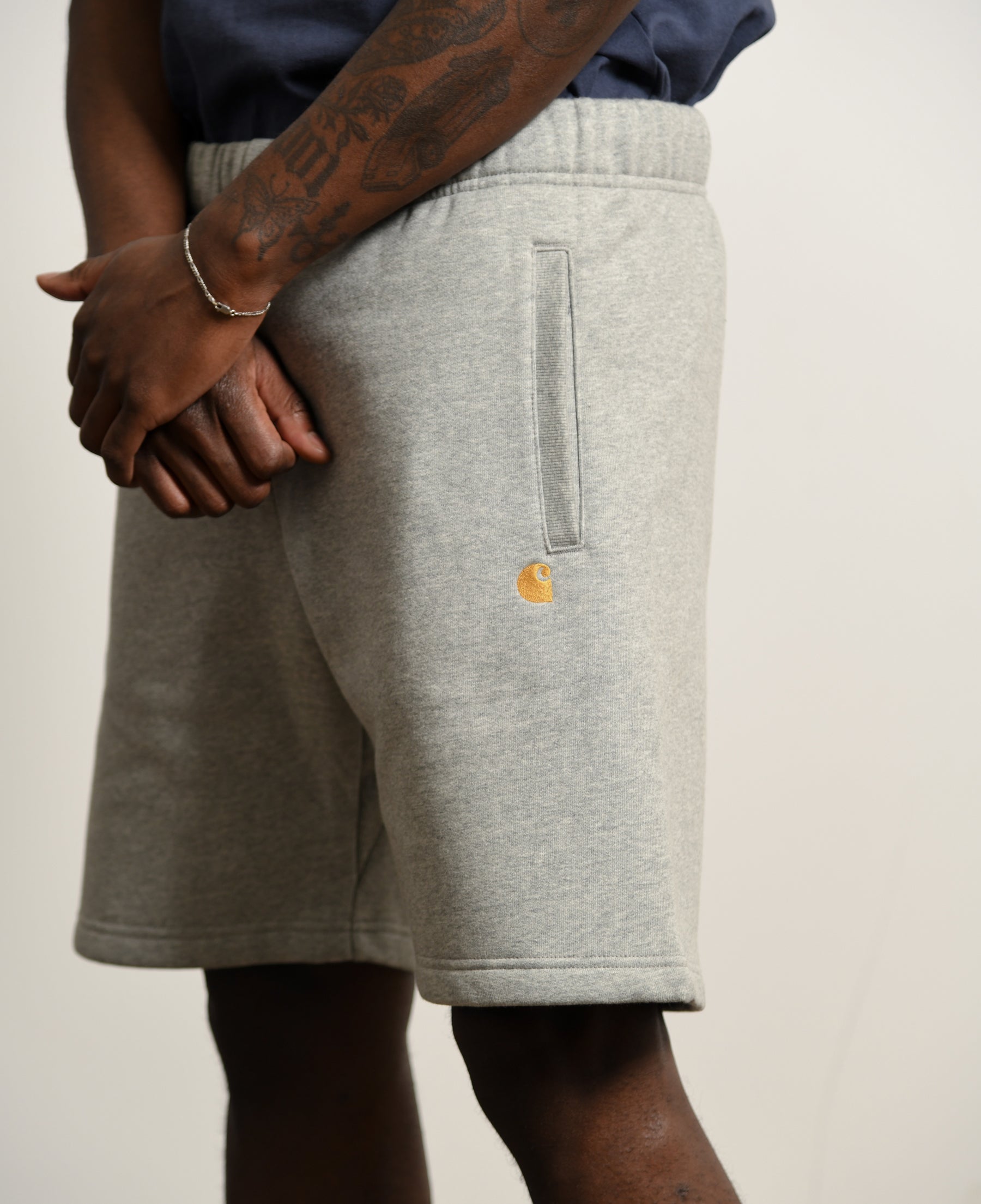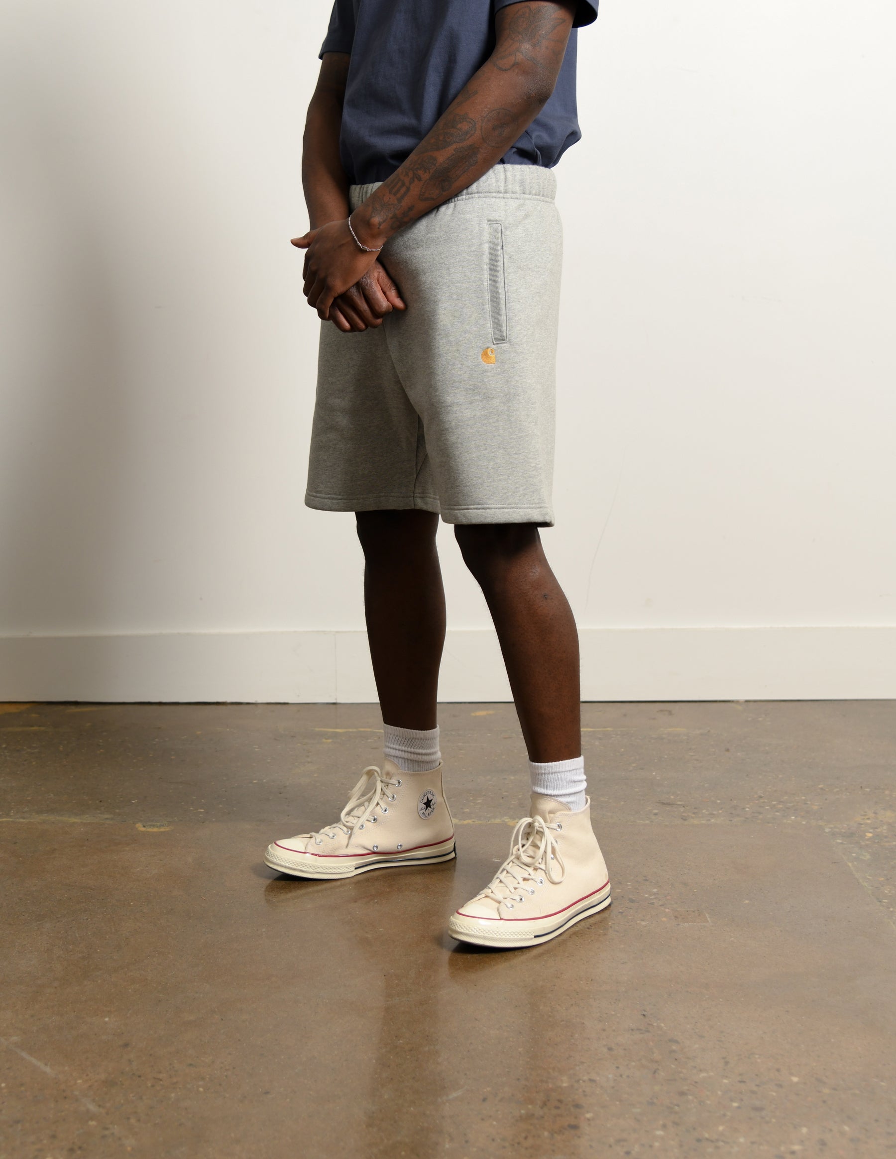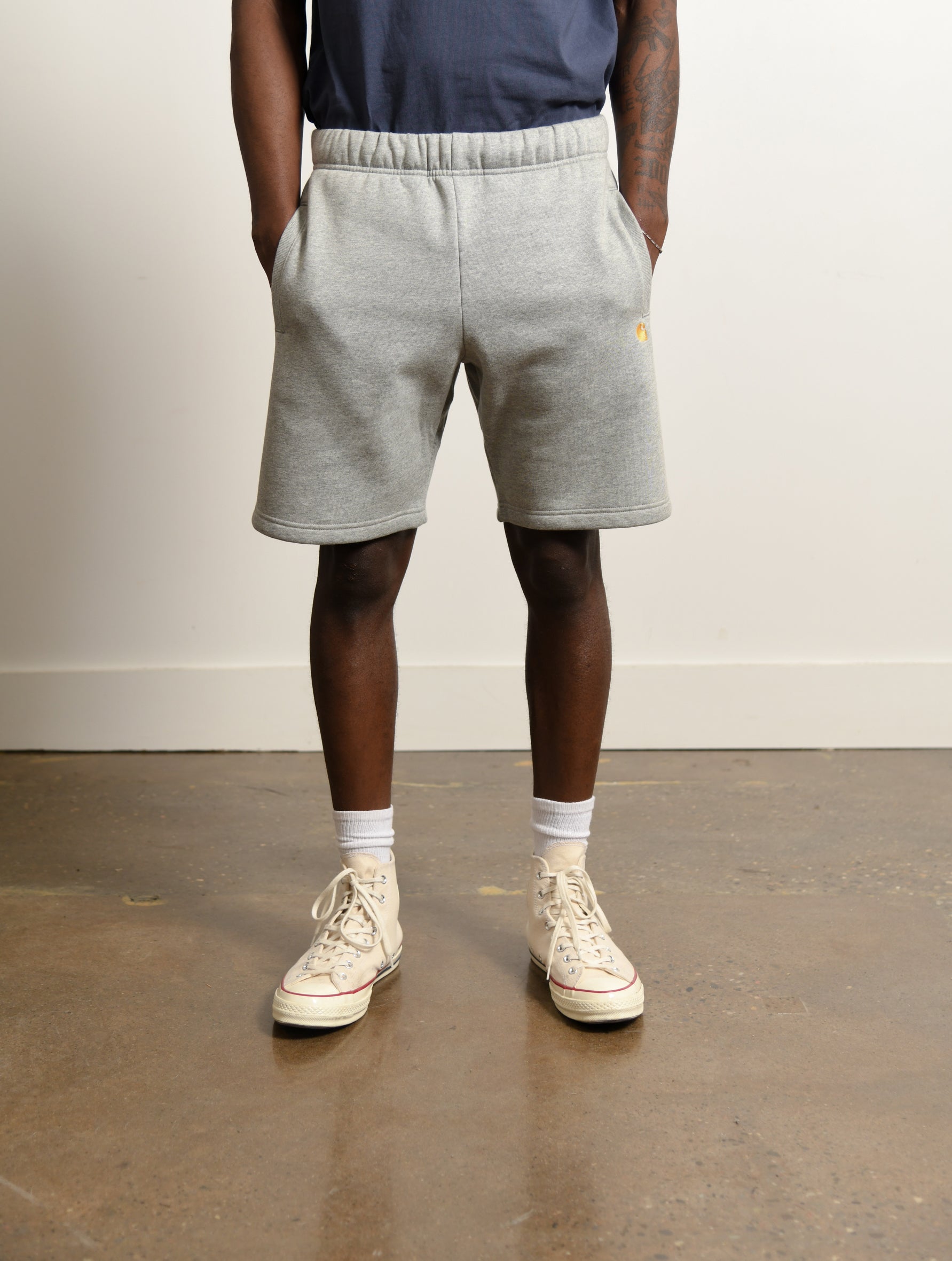 - Heavyweight cotton-poly blend jersey sweat shorts in Heather Grey and Gold