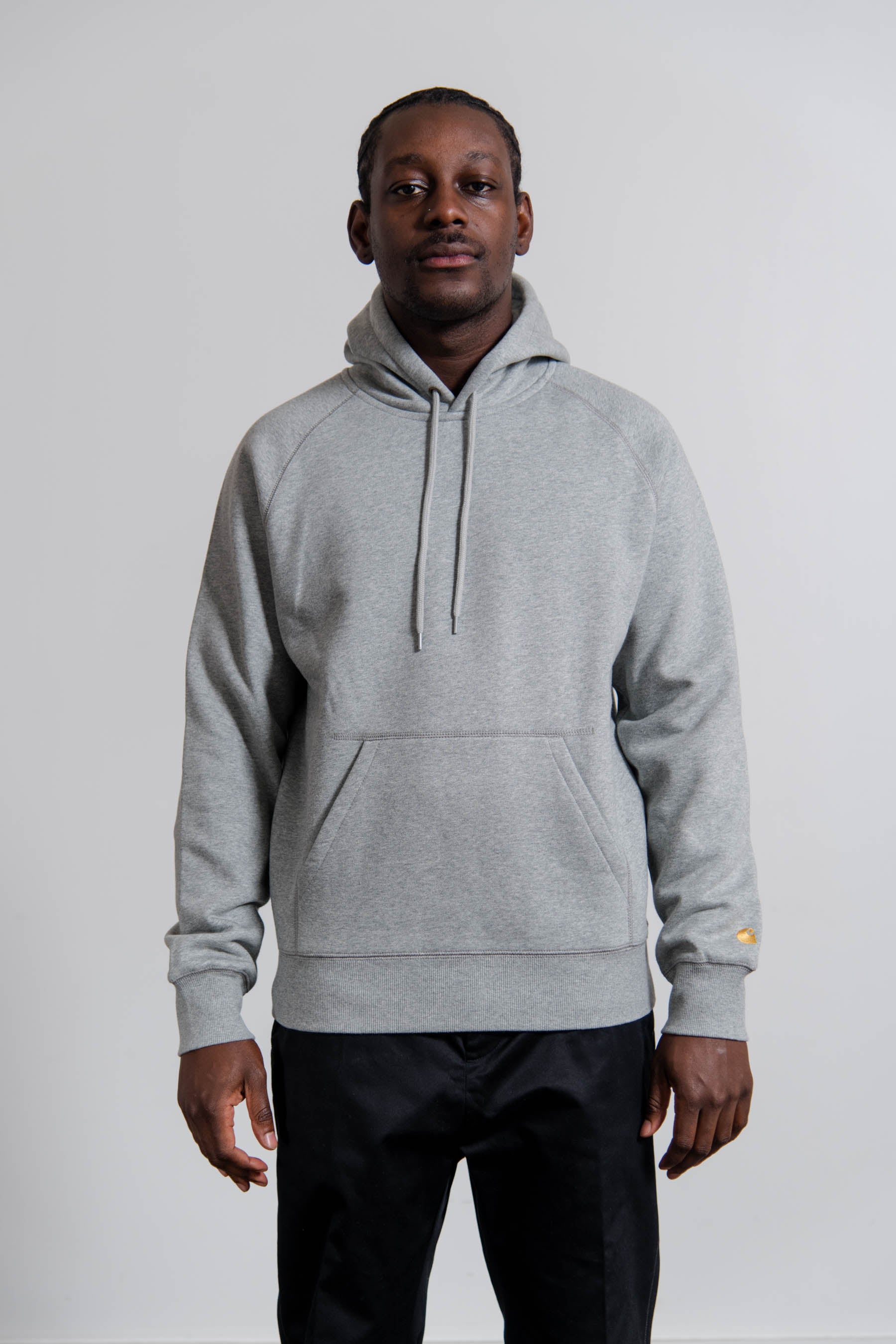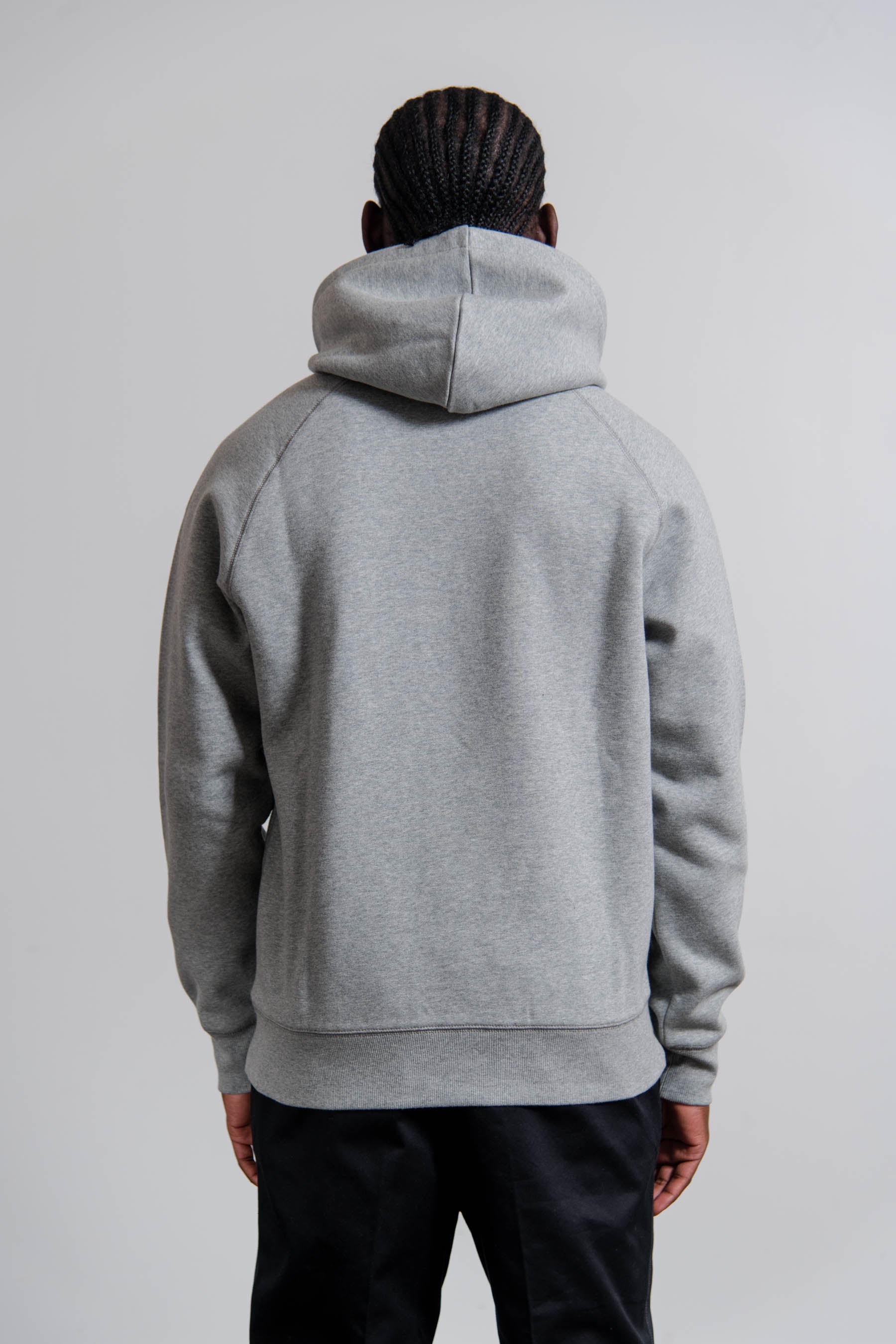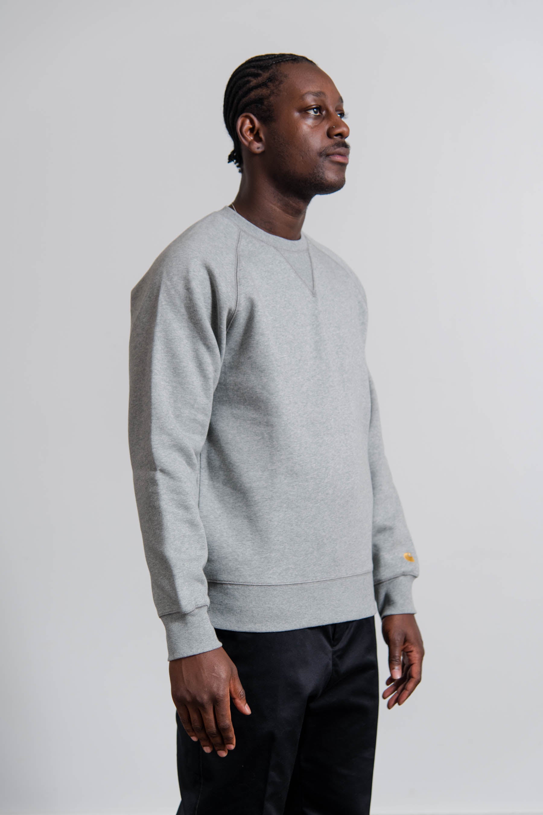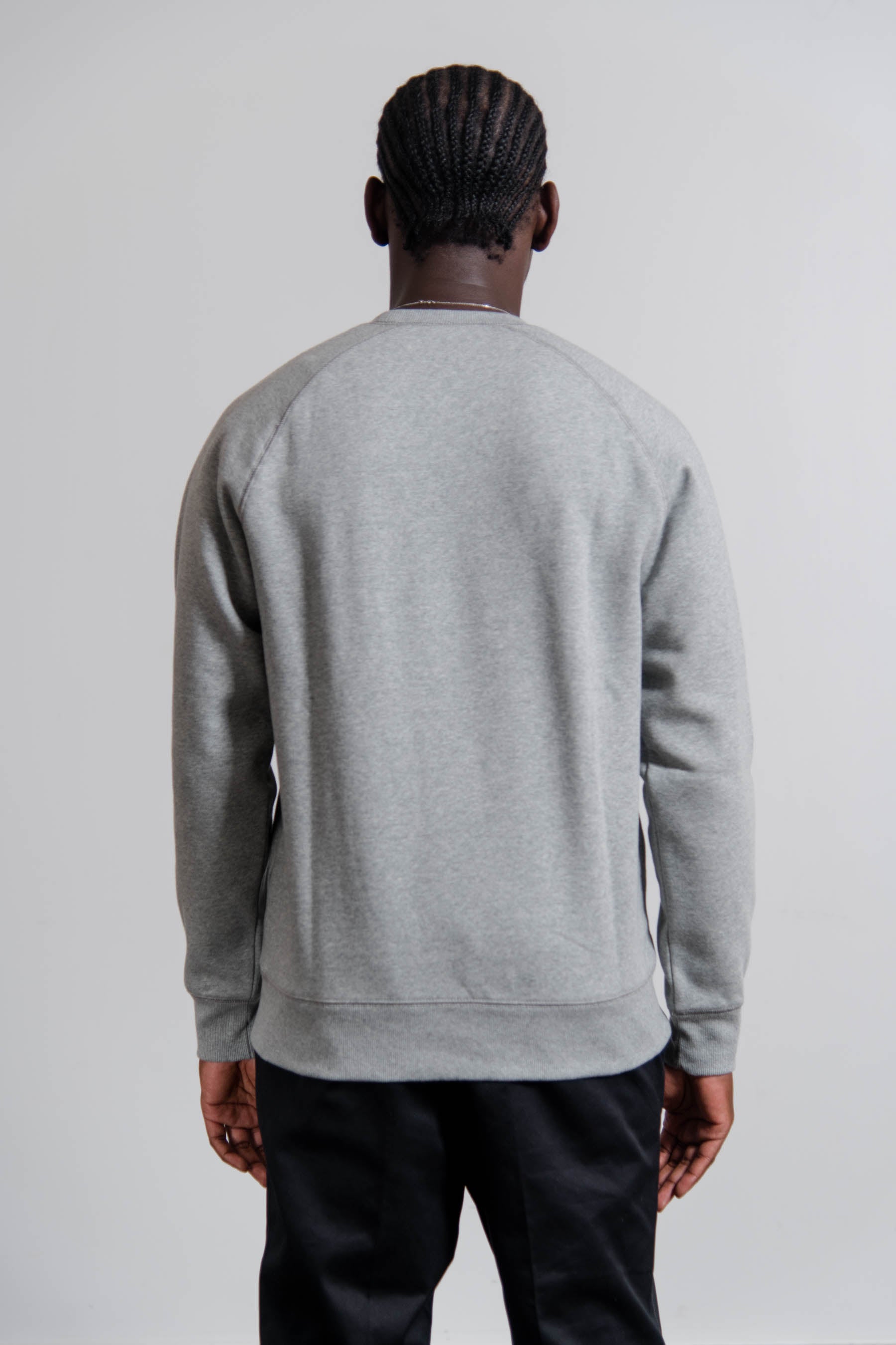 - Long sleeve cotton-poly blend fleece crewneck sweater in Heather Grey