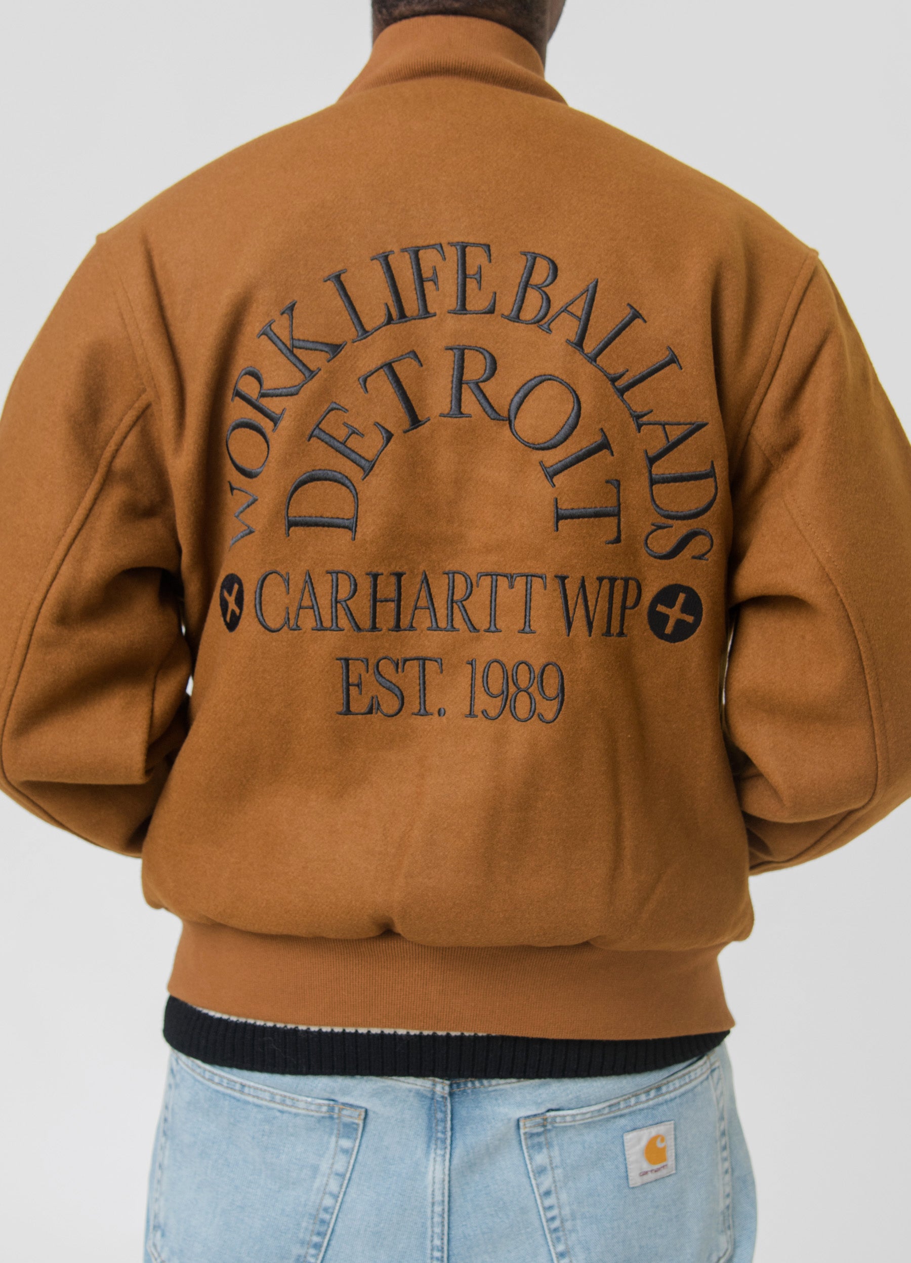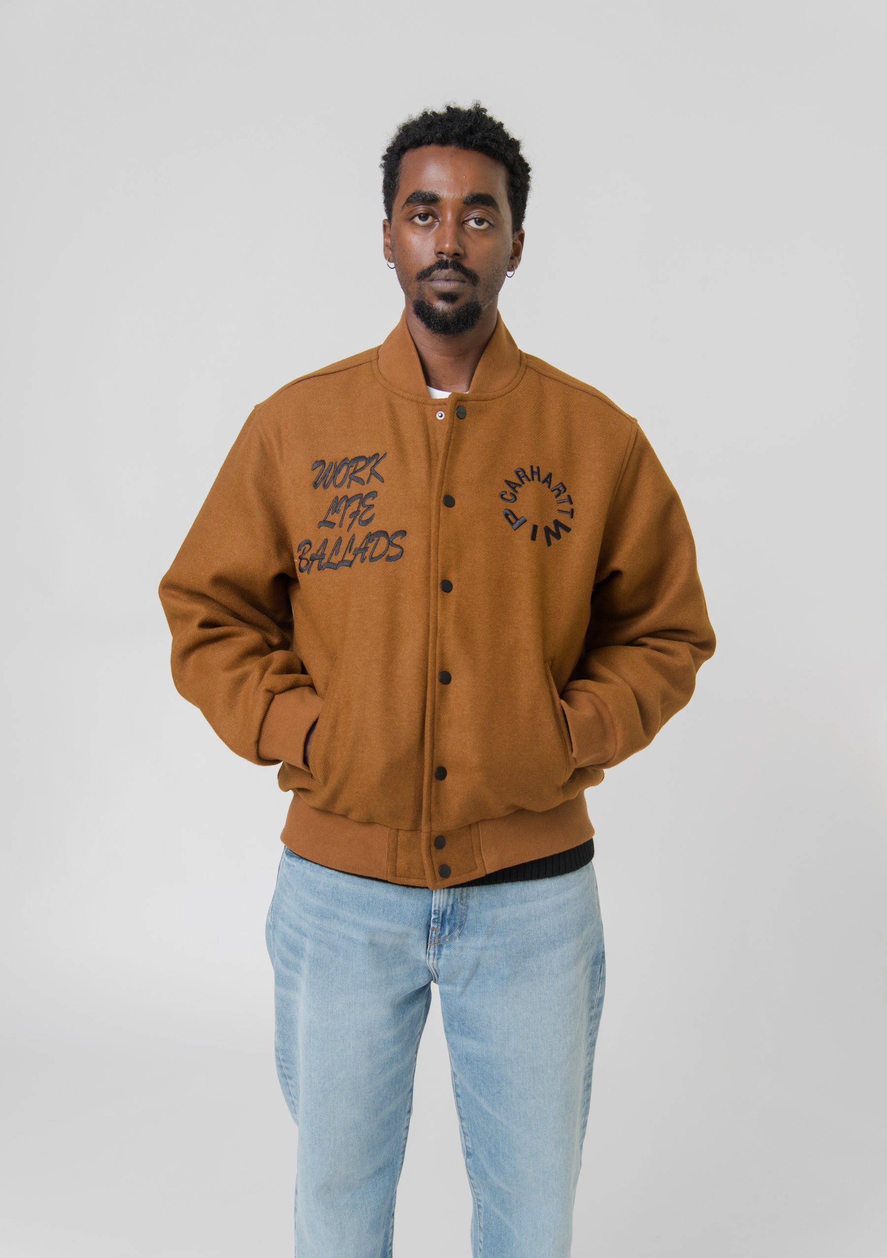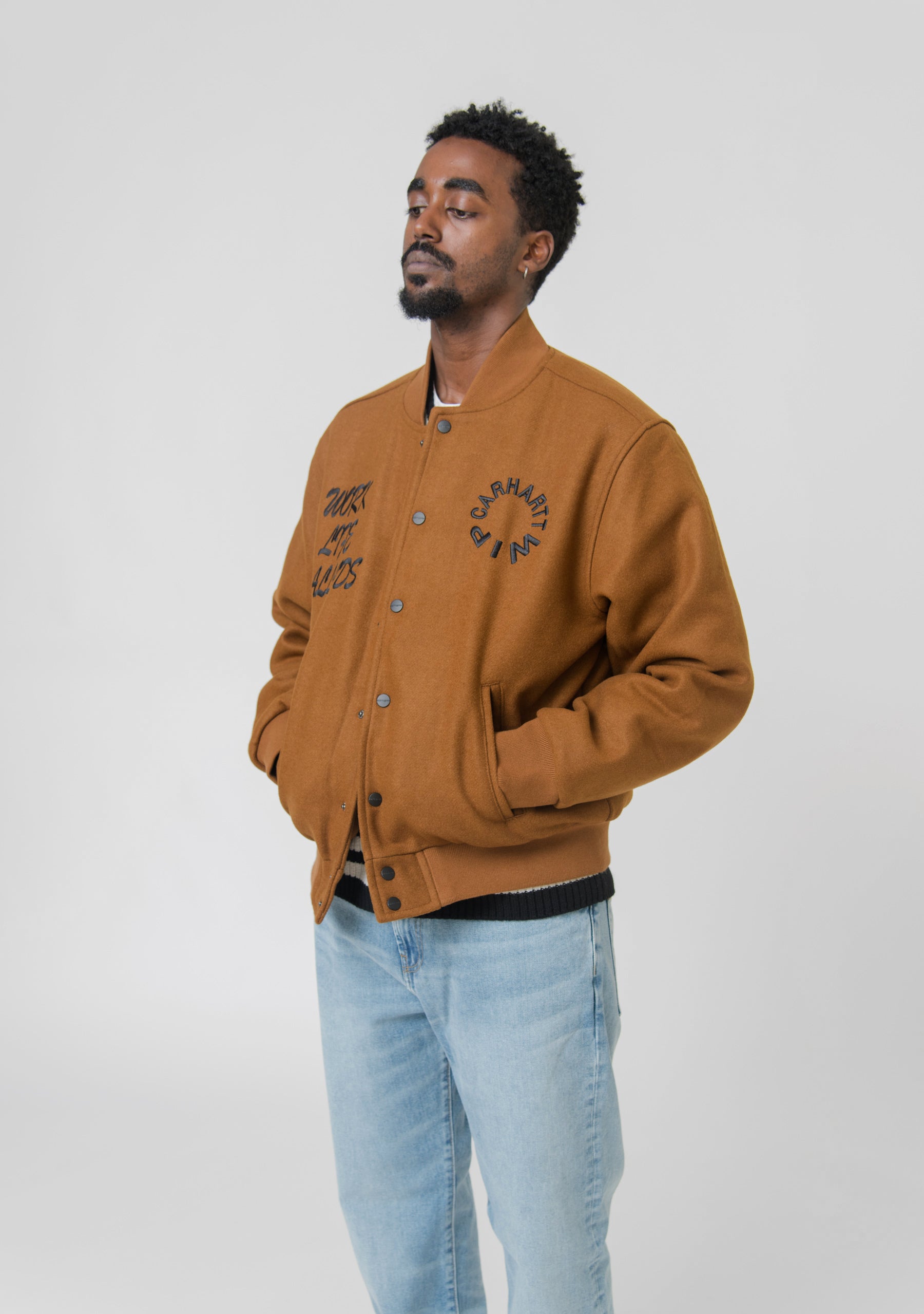 - Carhartt varsity bomber jacket in Deep Heather Brown