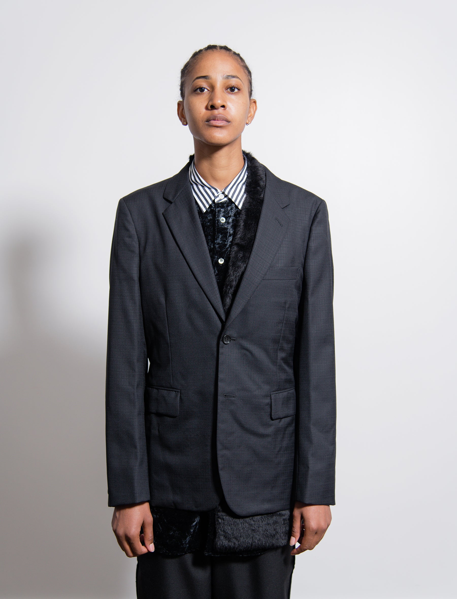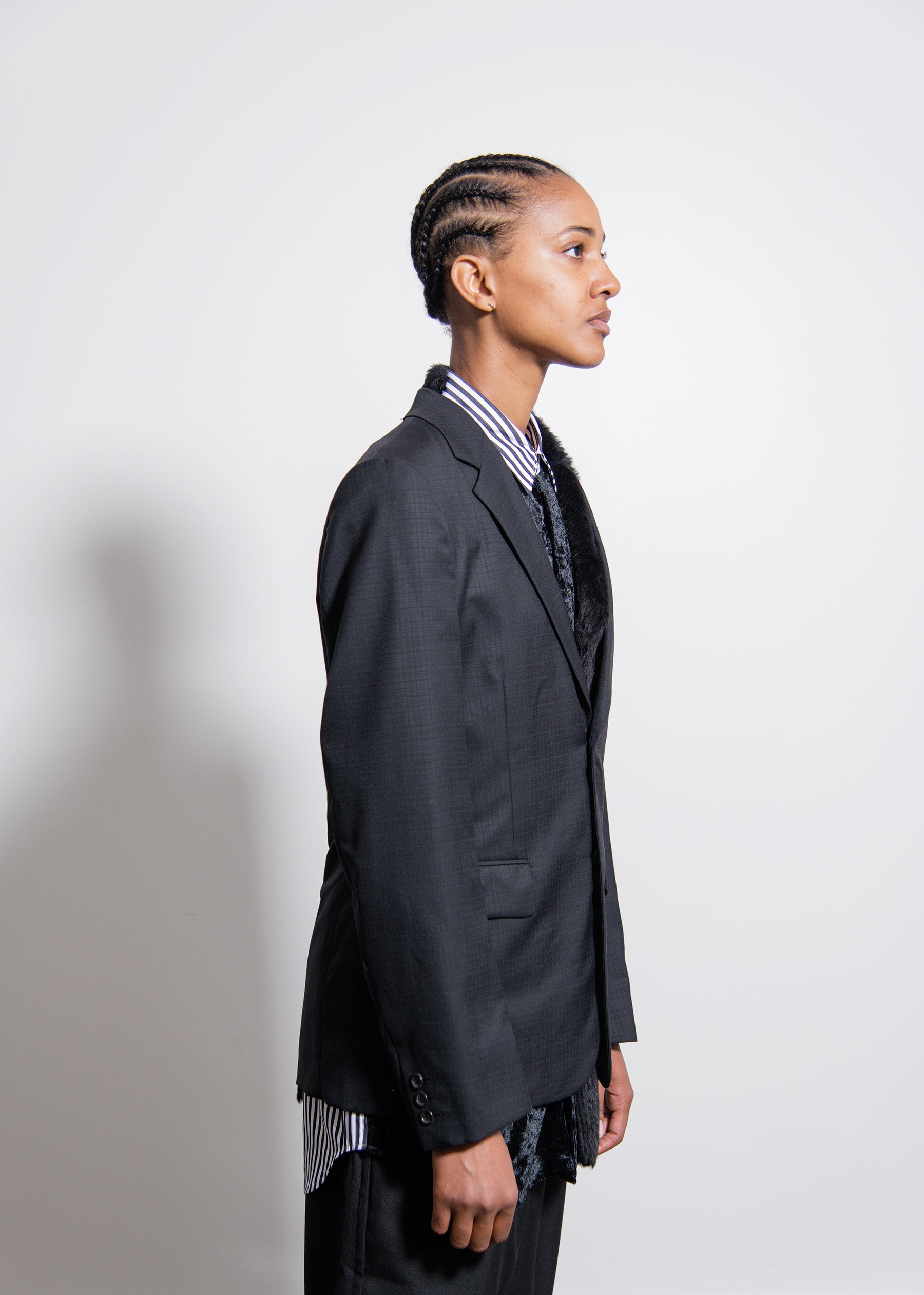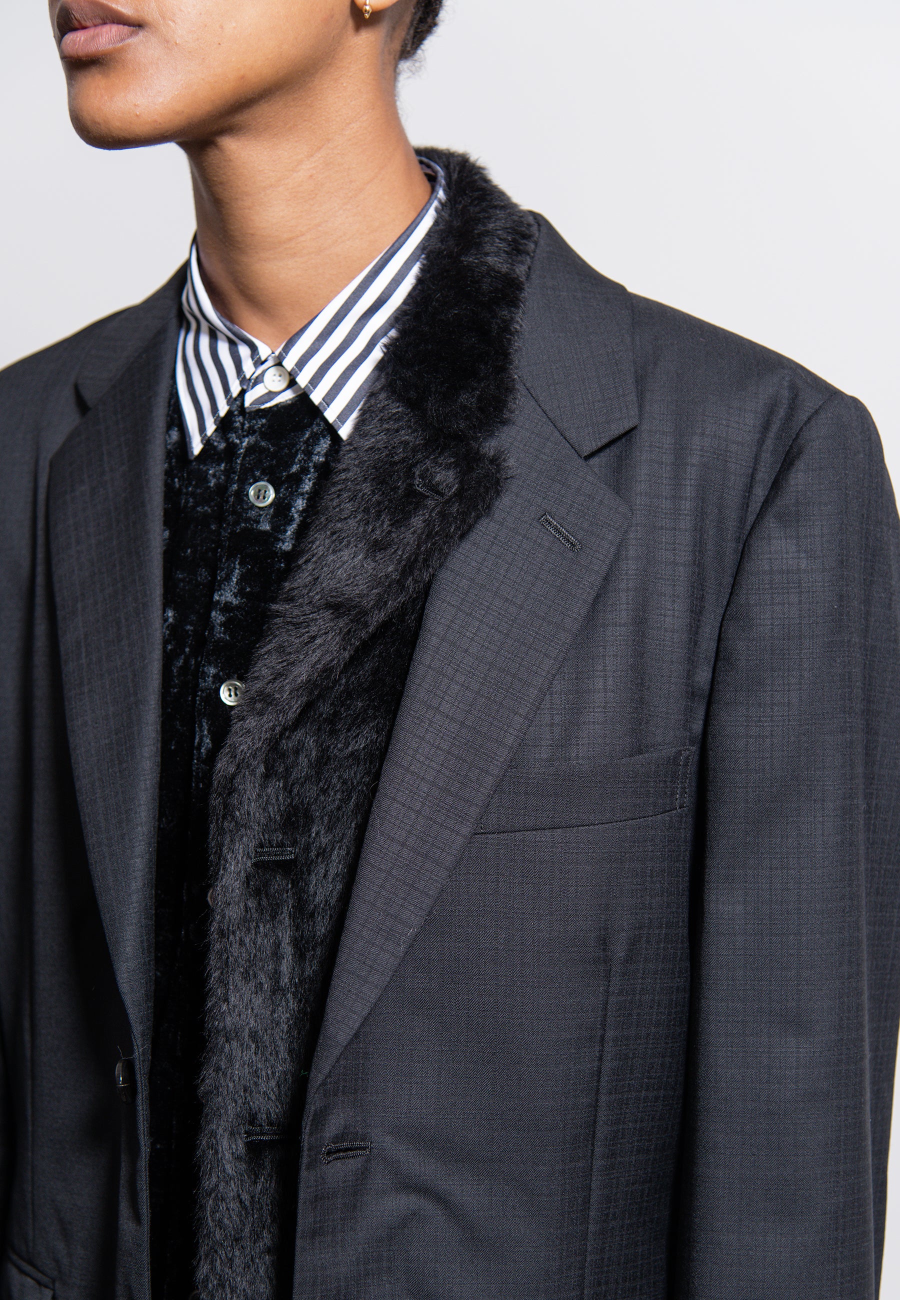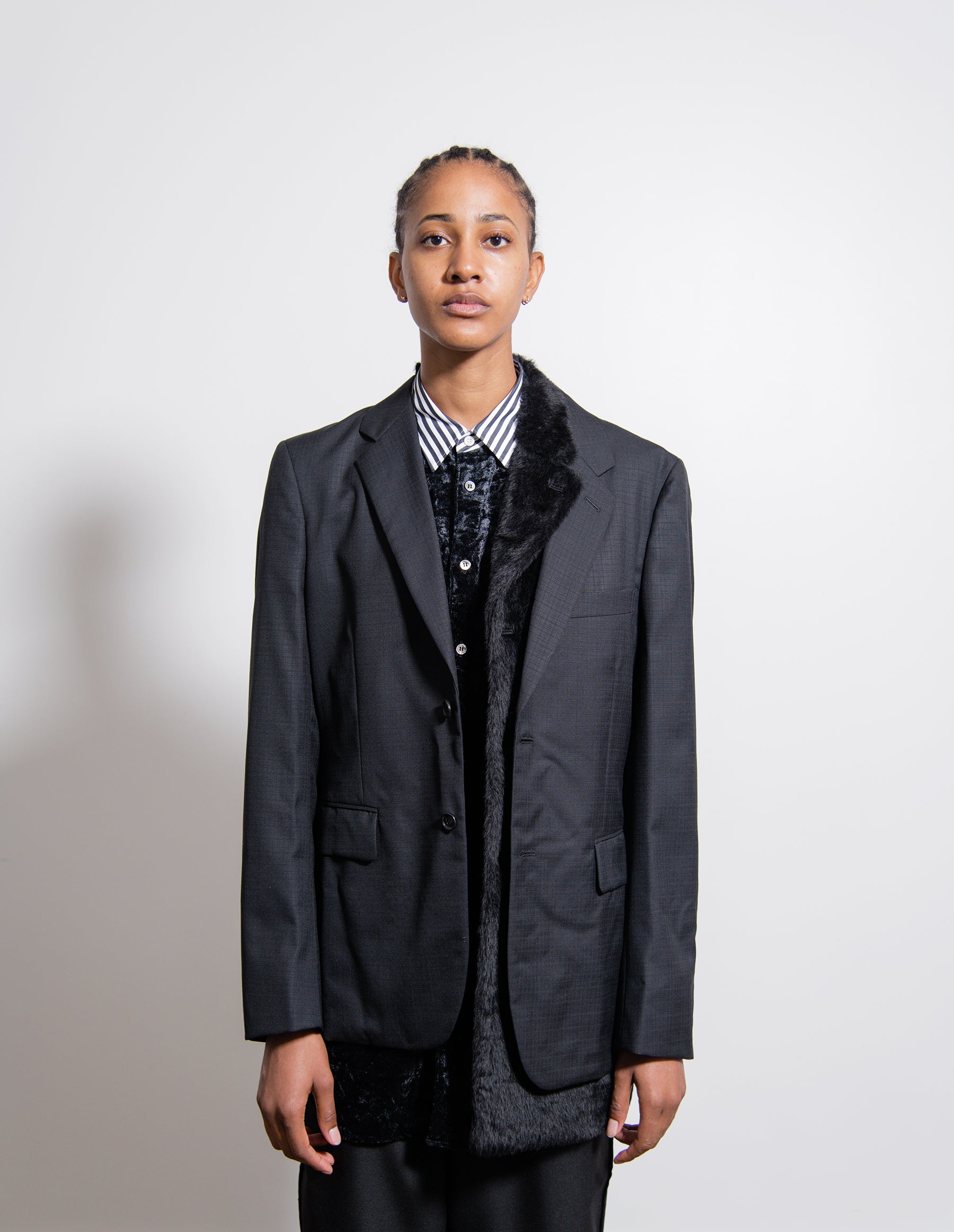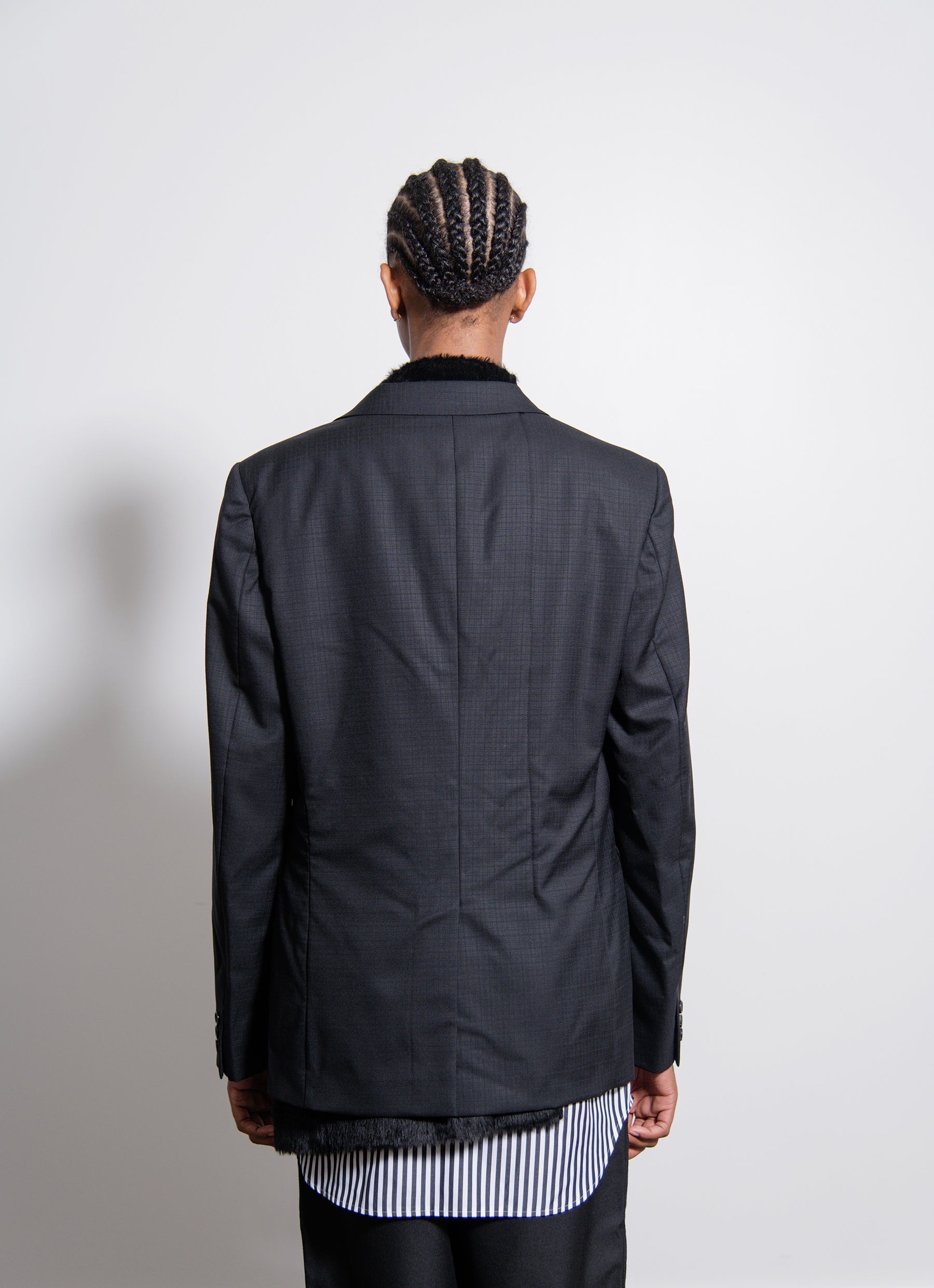 - Long sleeve wool shadow check synthetic fur blazer in black