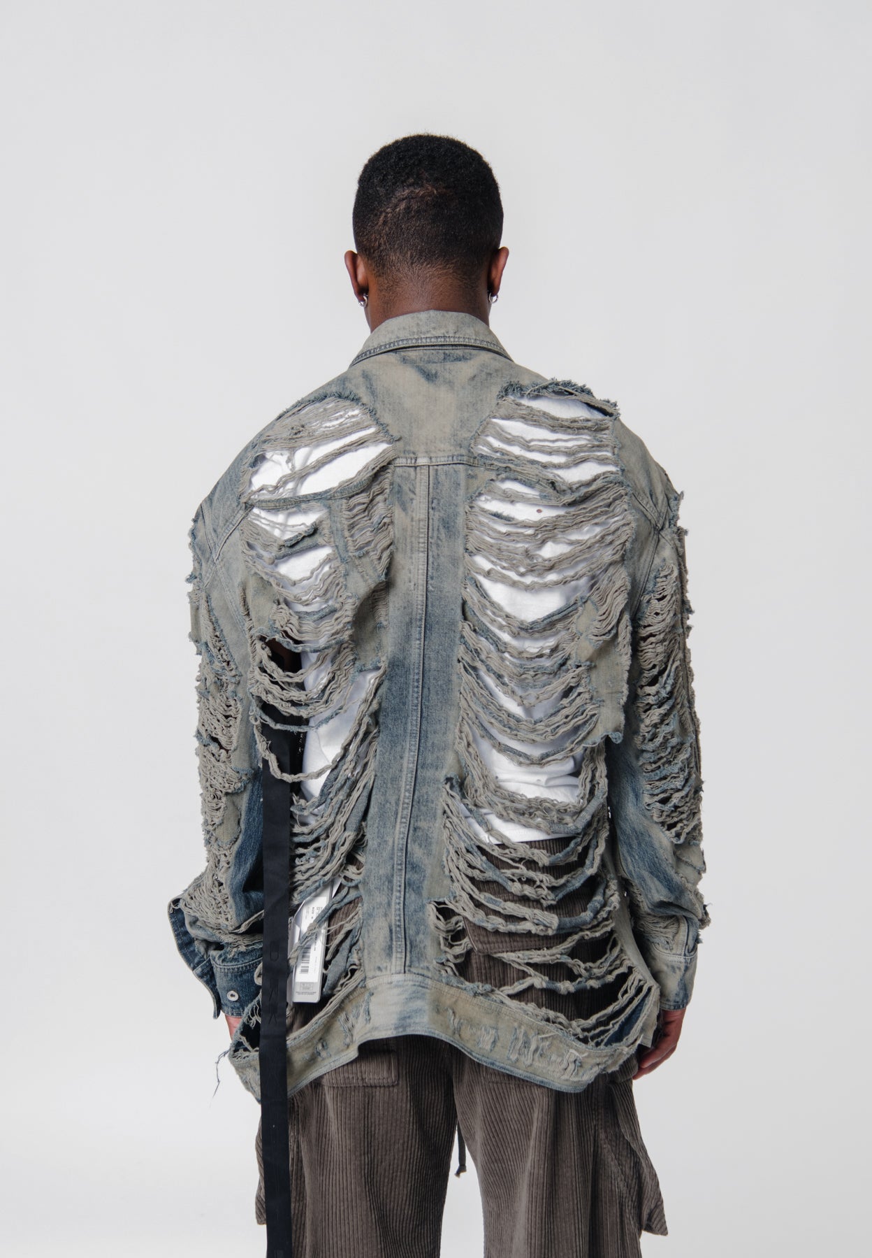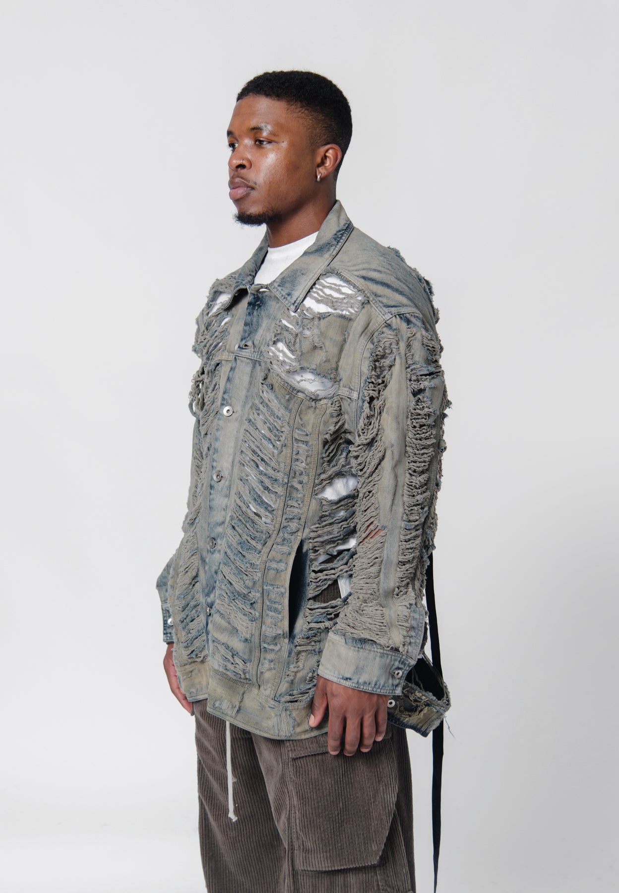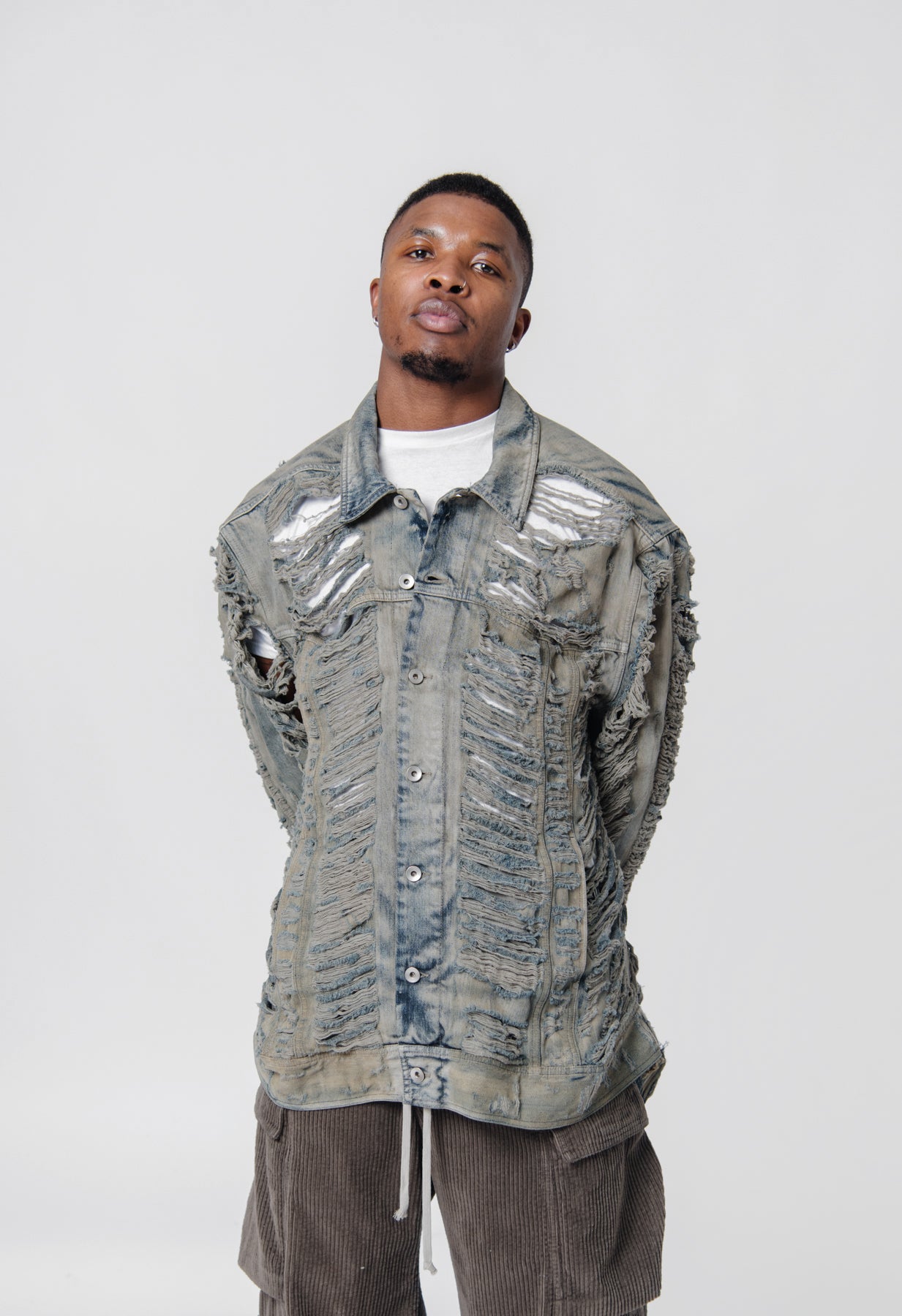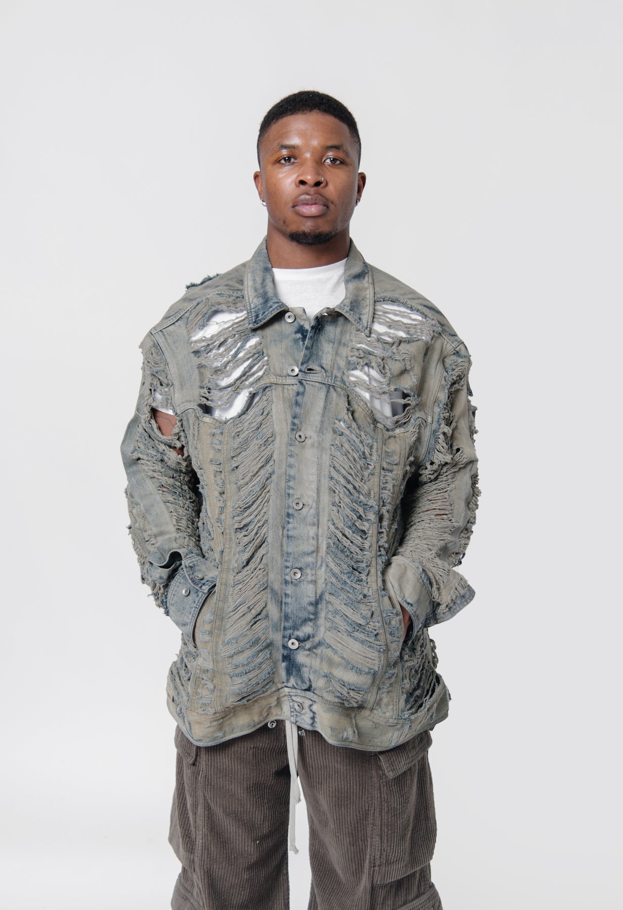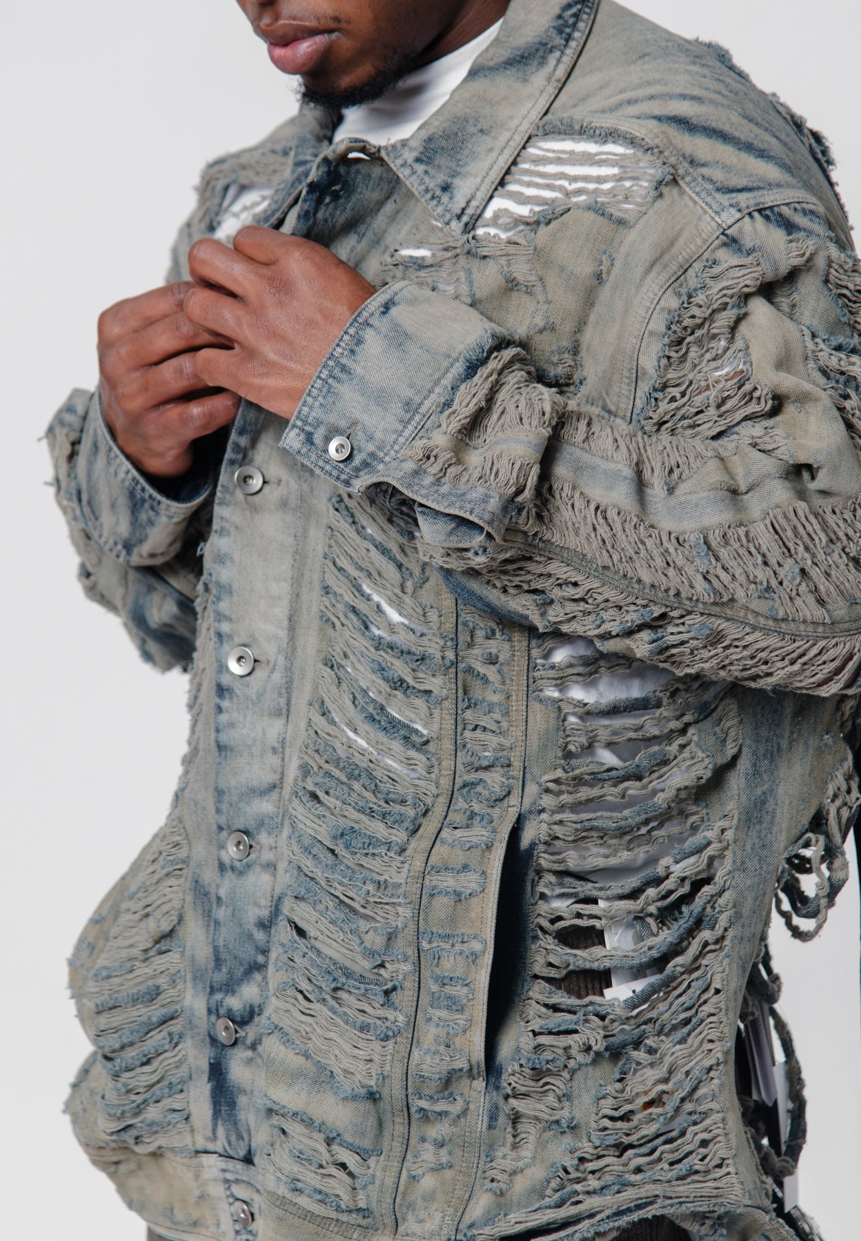 - Long sleeve distressed denim jacket in Mineral Pearl