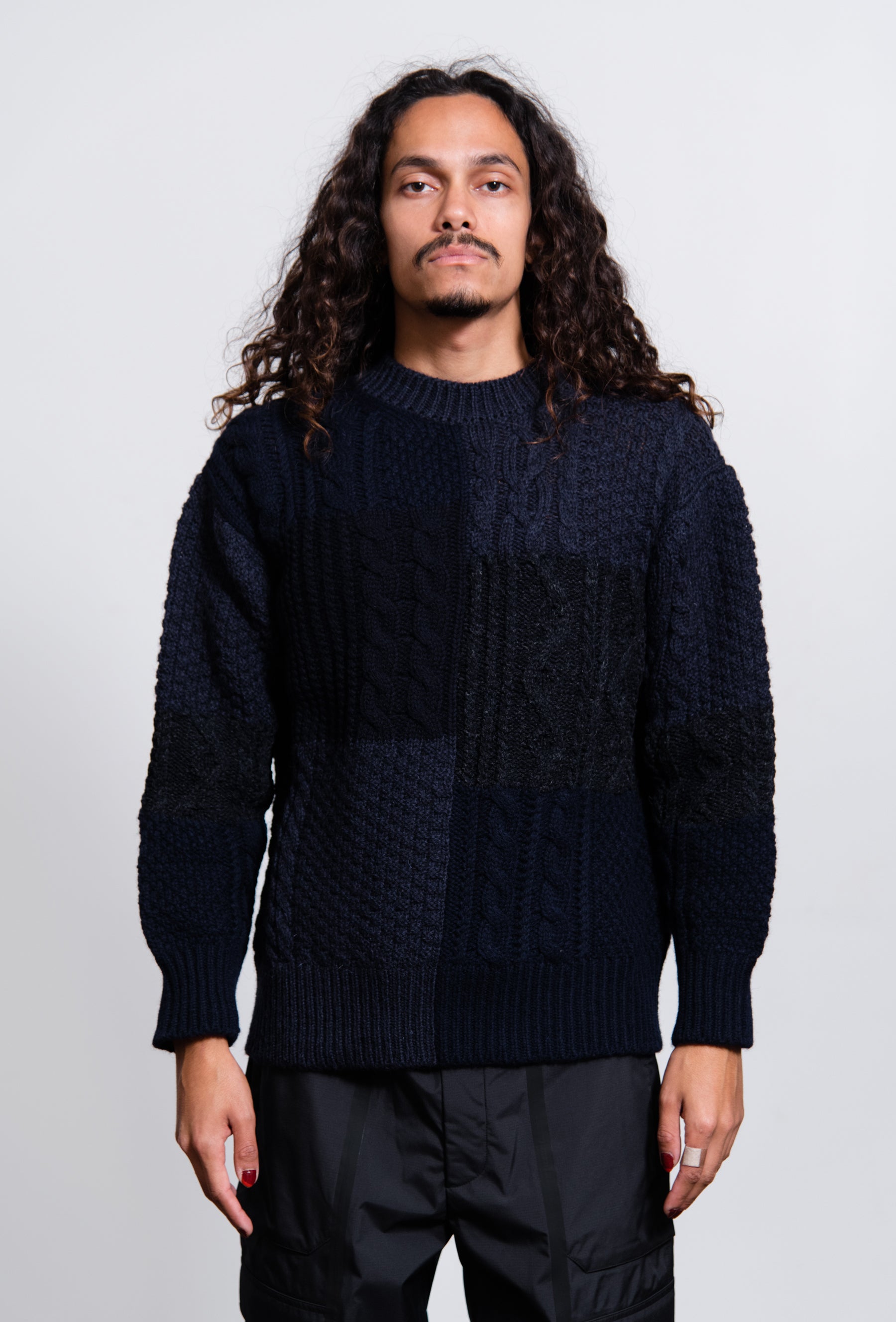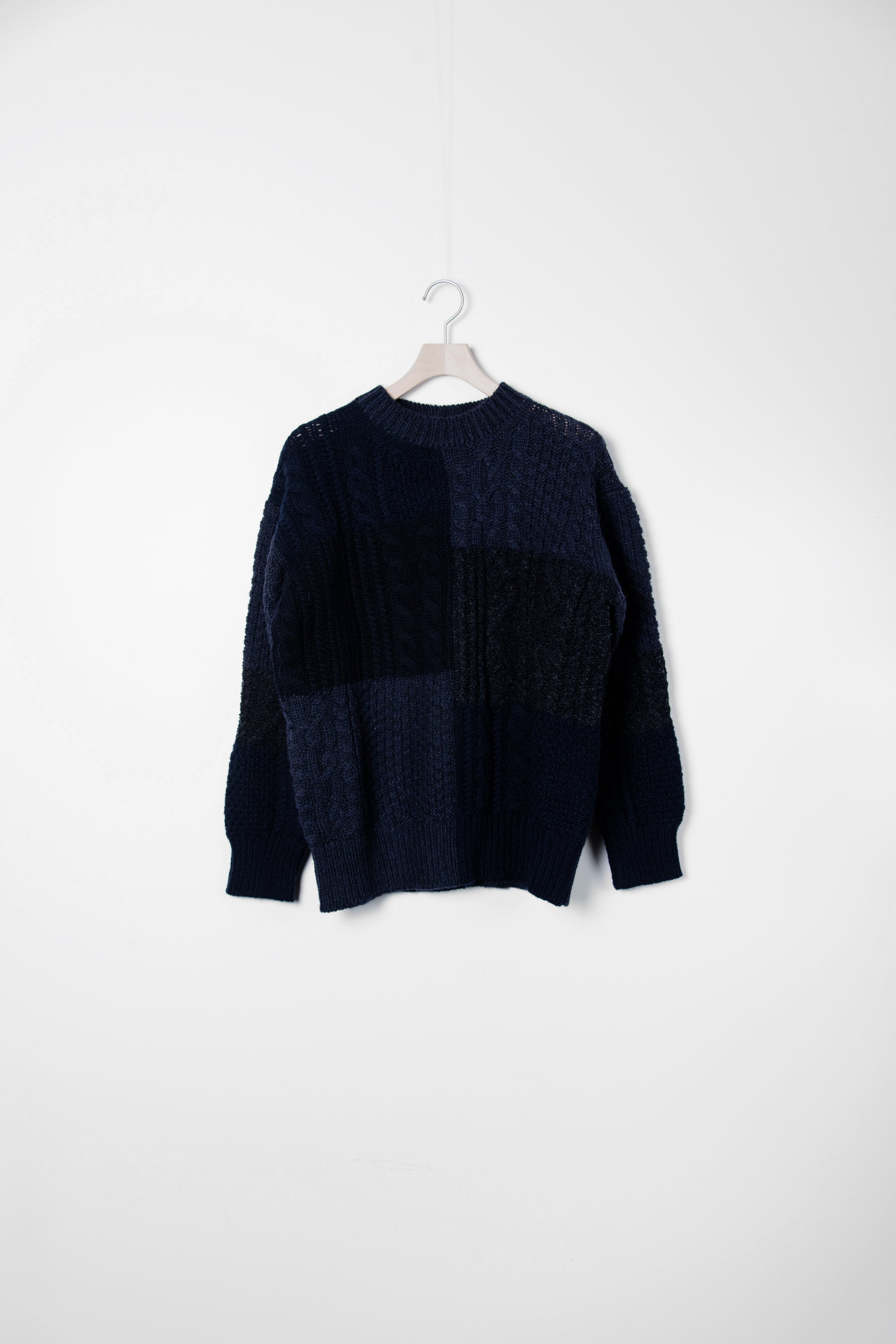 Shetland Wool Aran Pattern Knit Sweater Navy N007