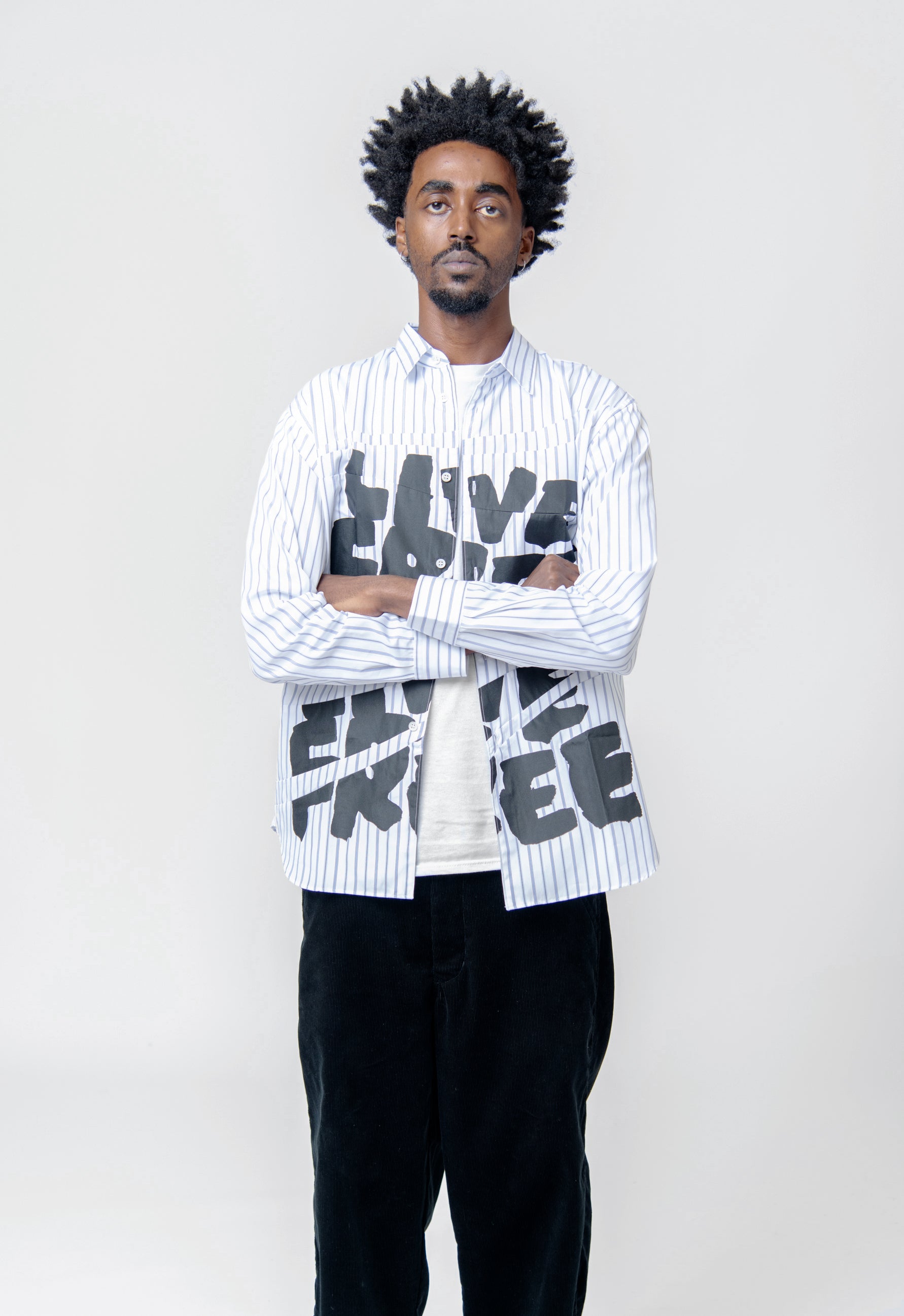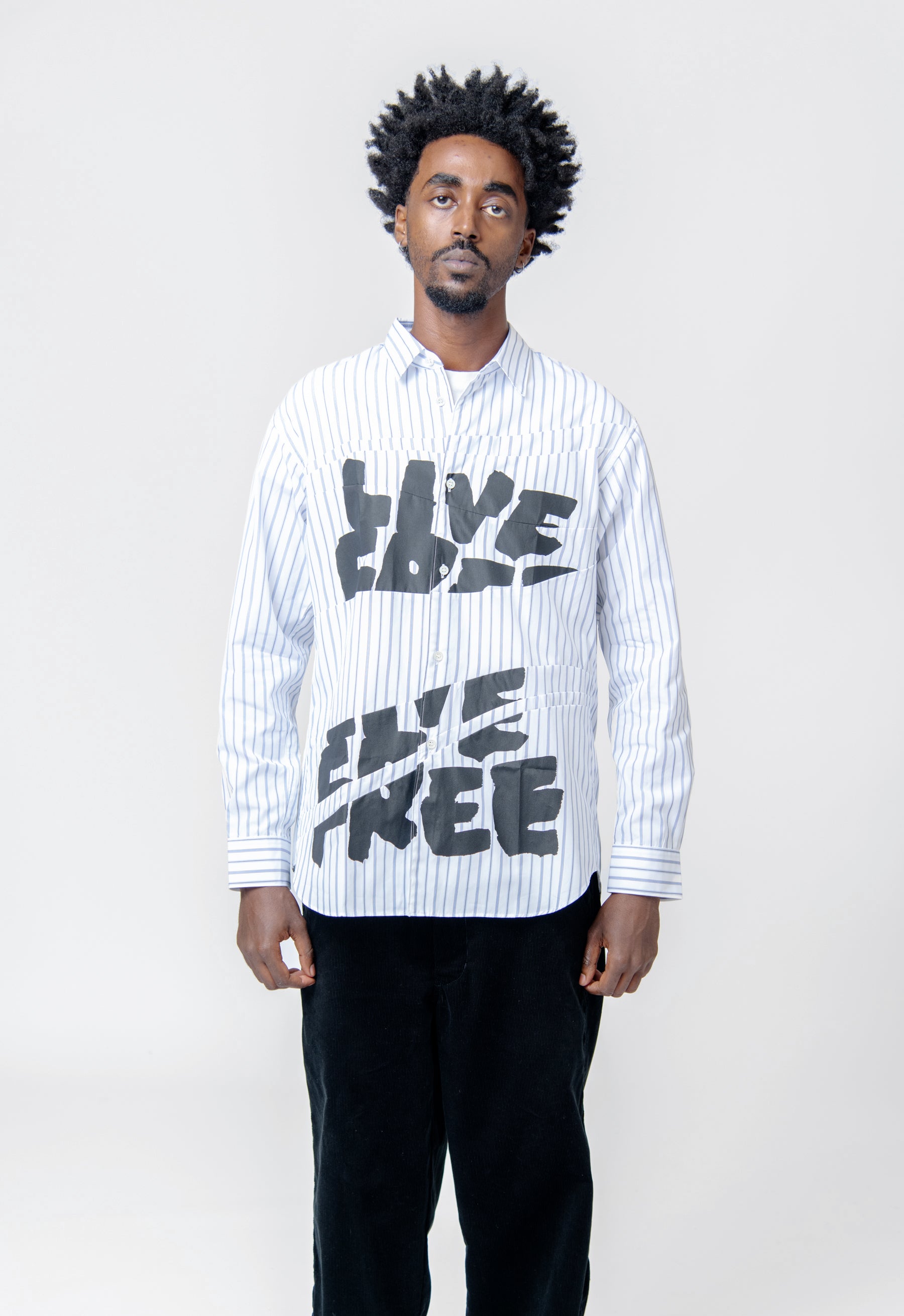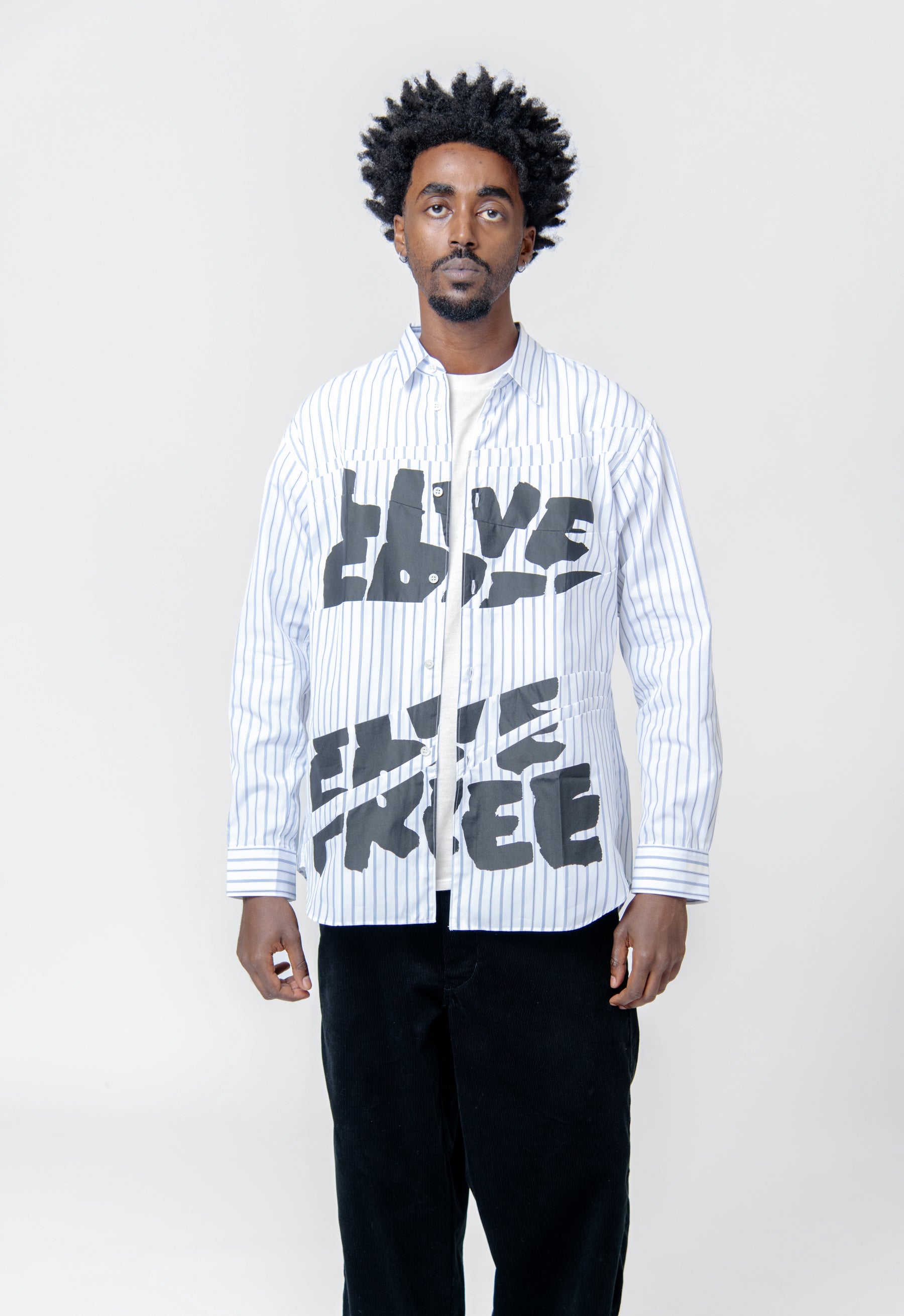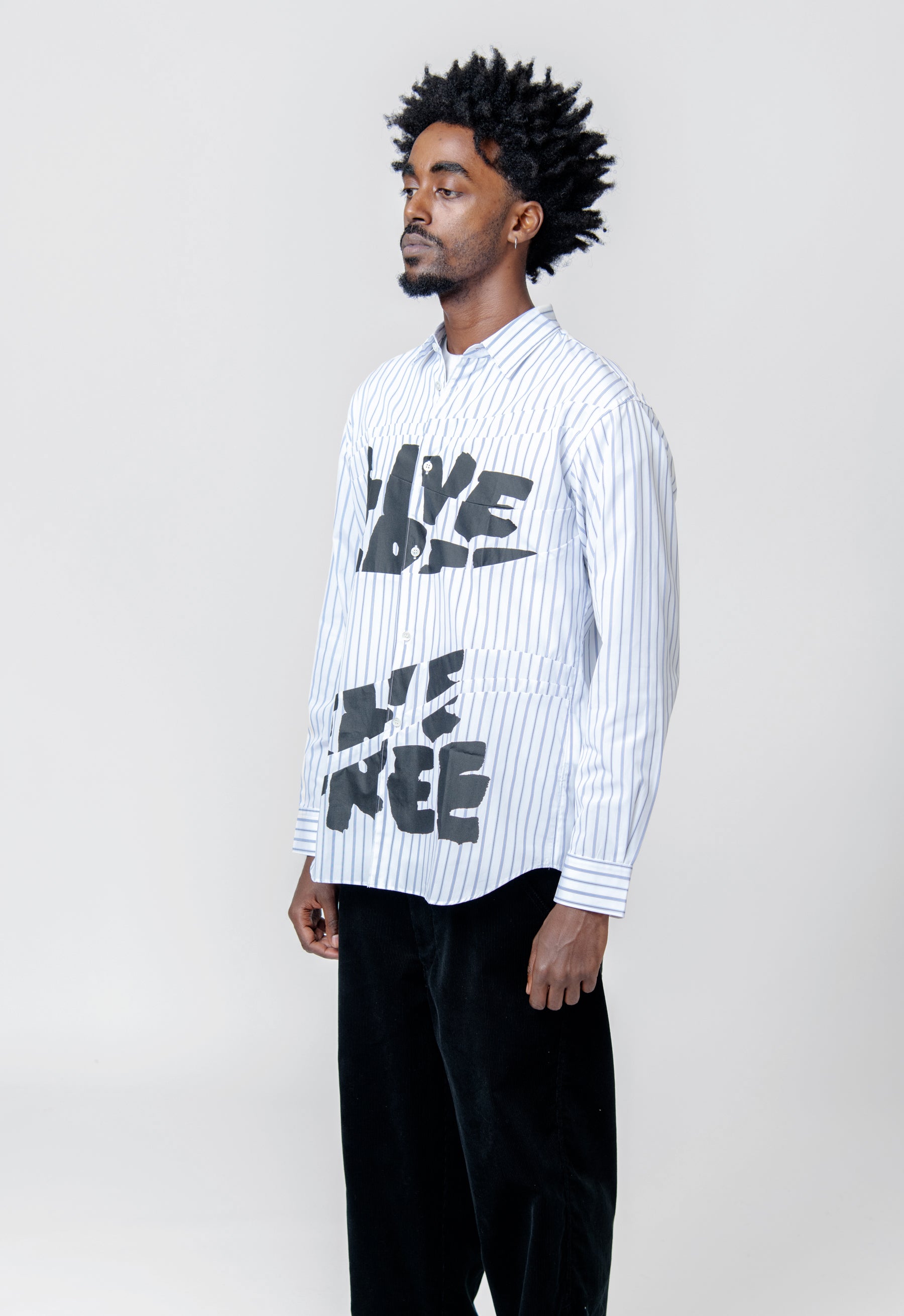 Live Free Curved Printed Long Sleeve Button-Up Shirt White/Blue FN-B006-W24