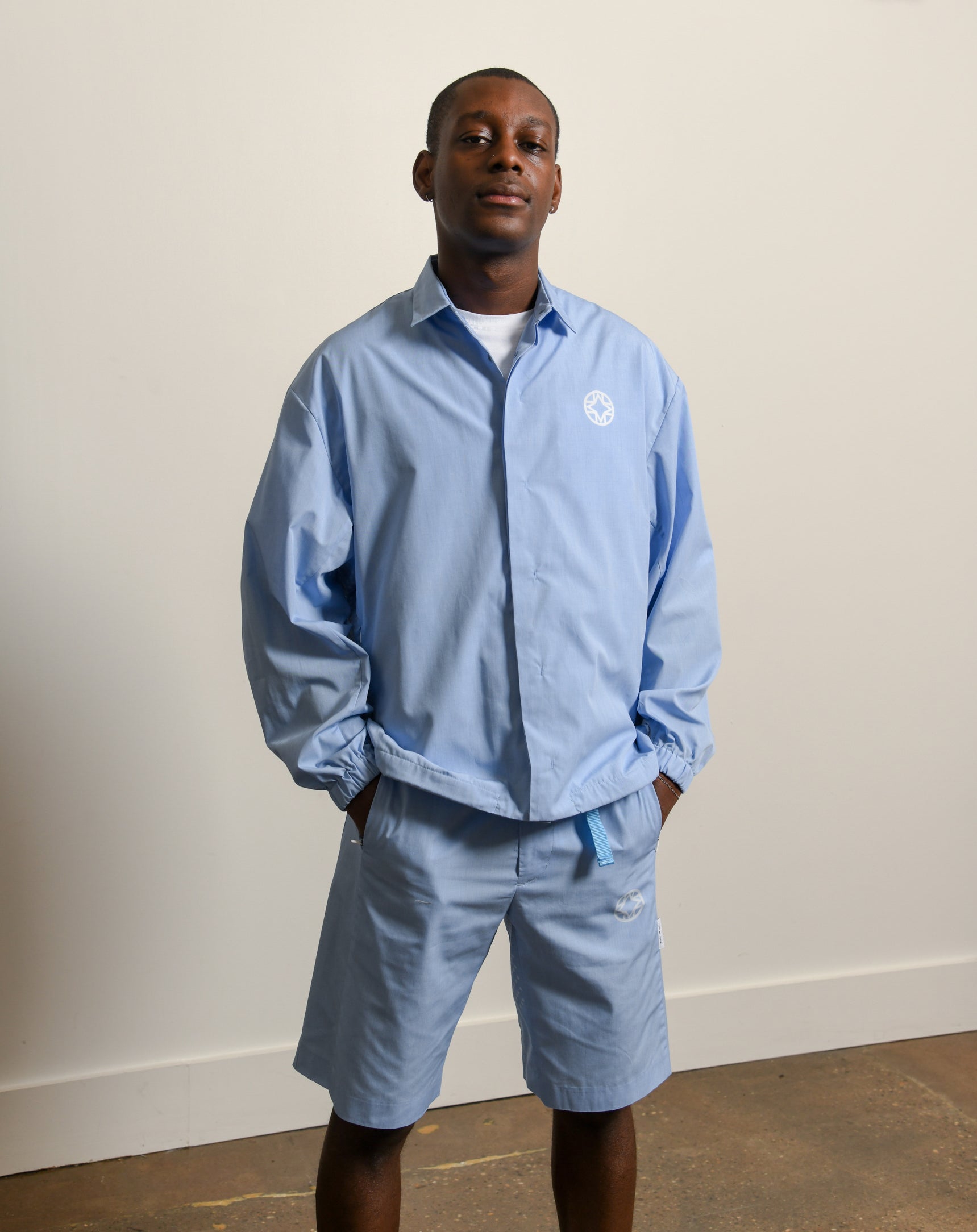 - Long sleeve poly-cotton blend chambray shirt in Light Blue