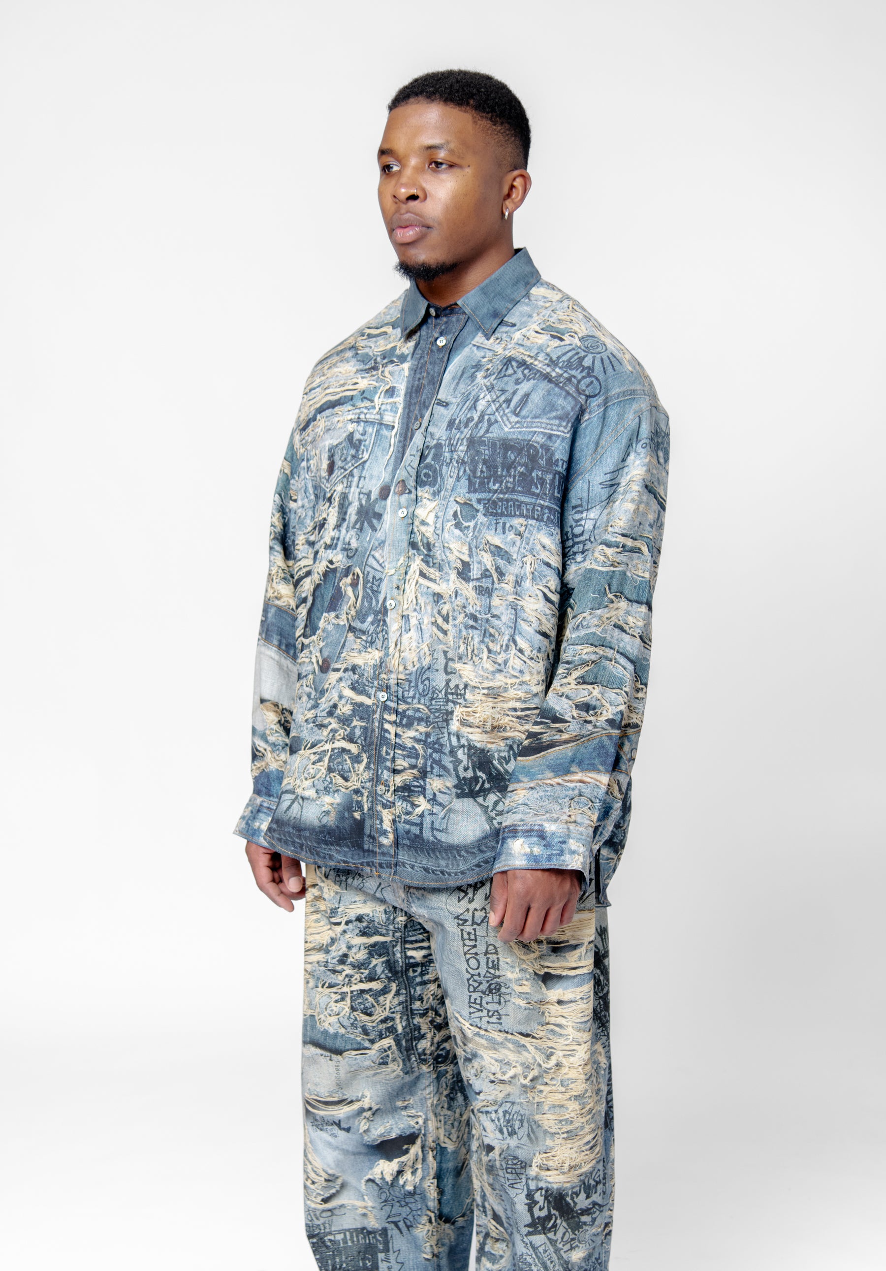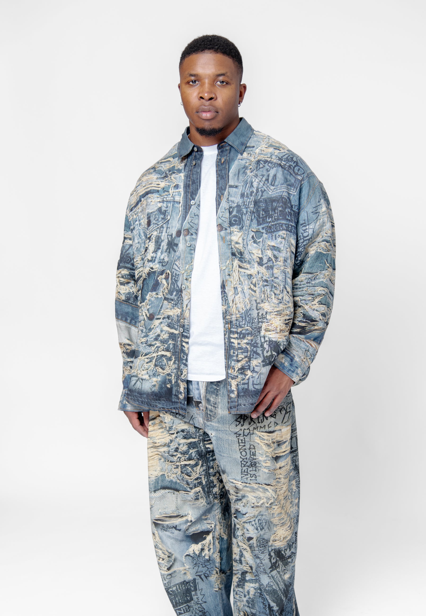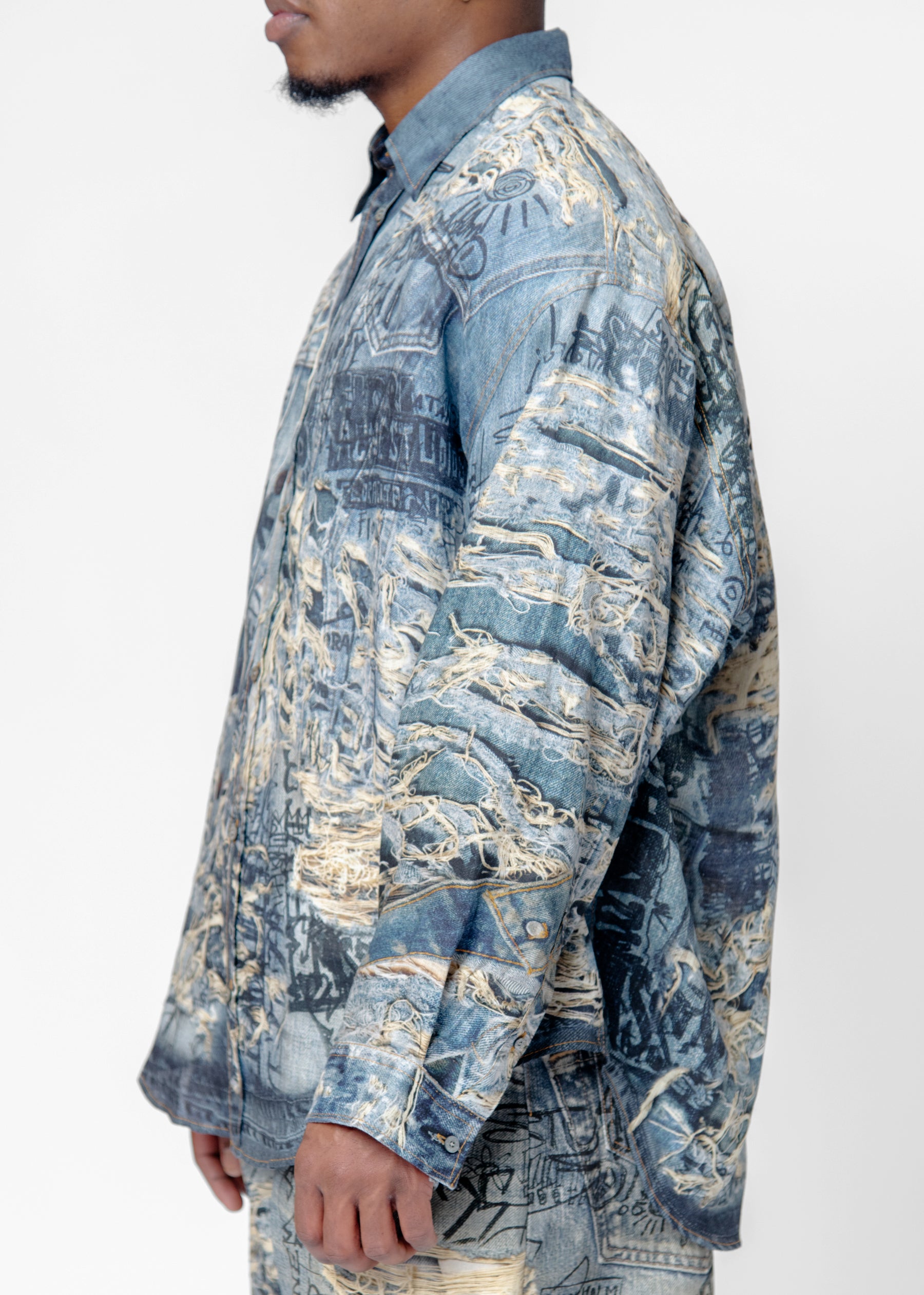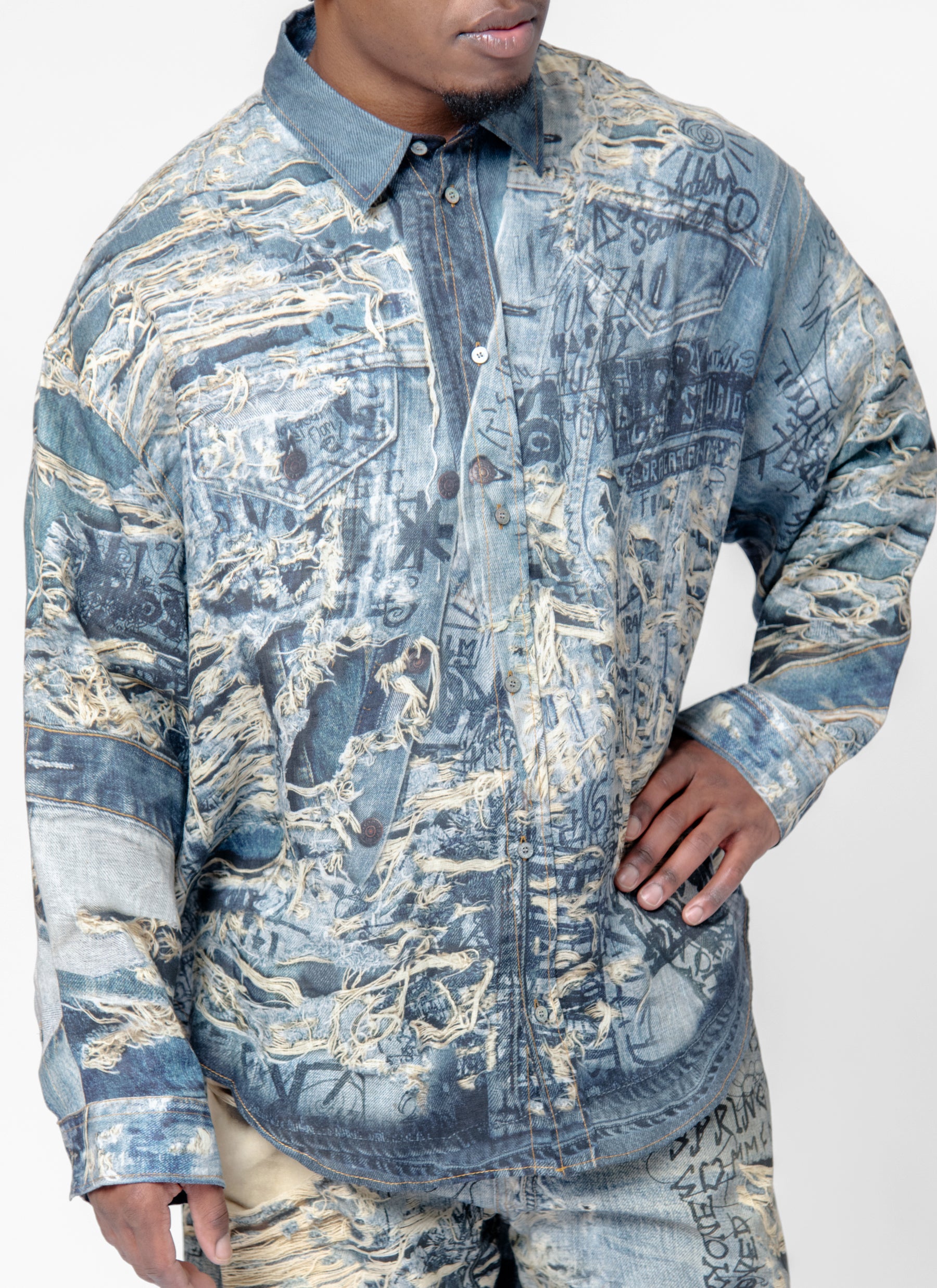 - Trompe l'oeil distressed denim print throughout