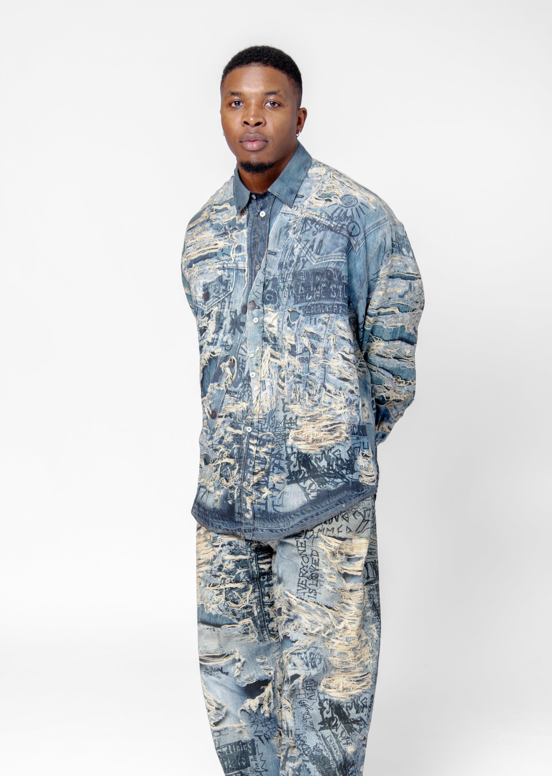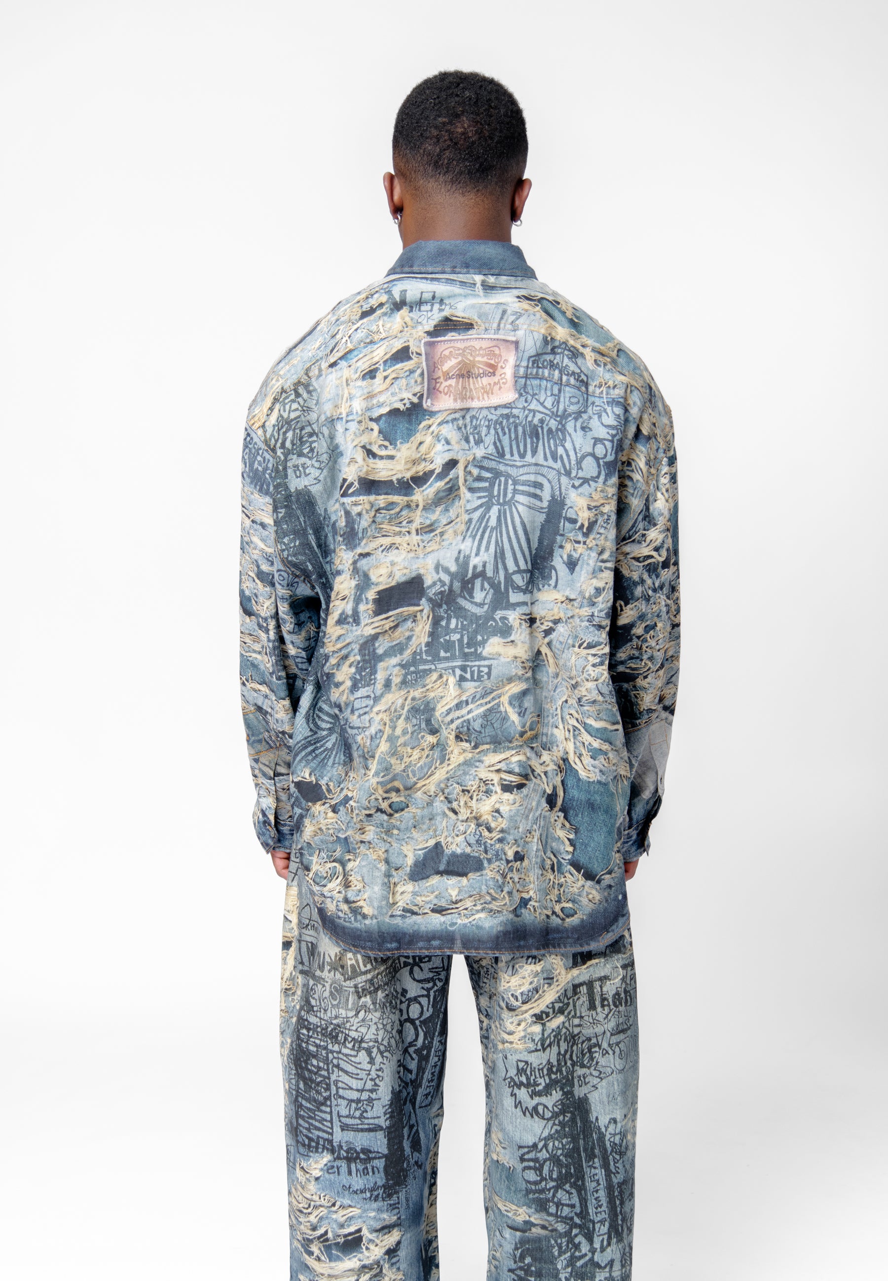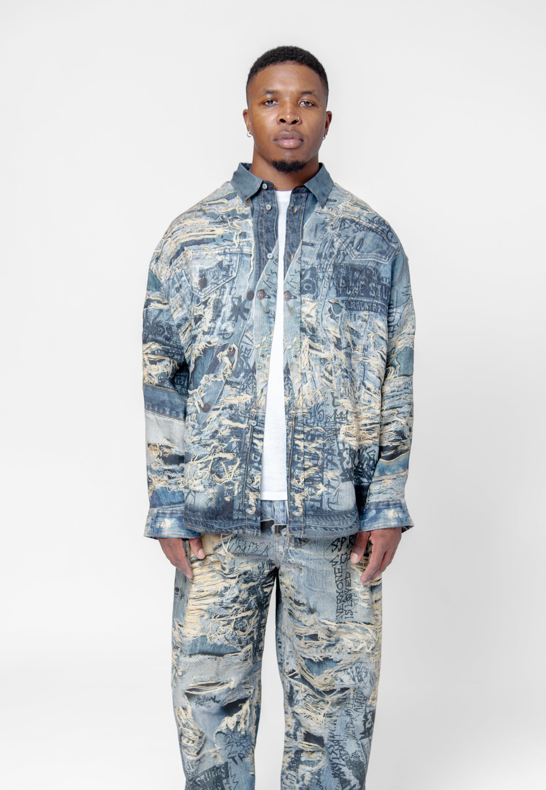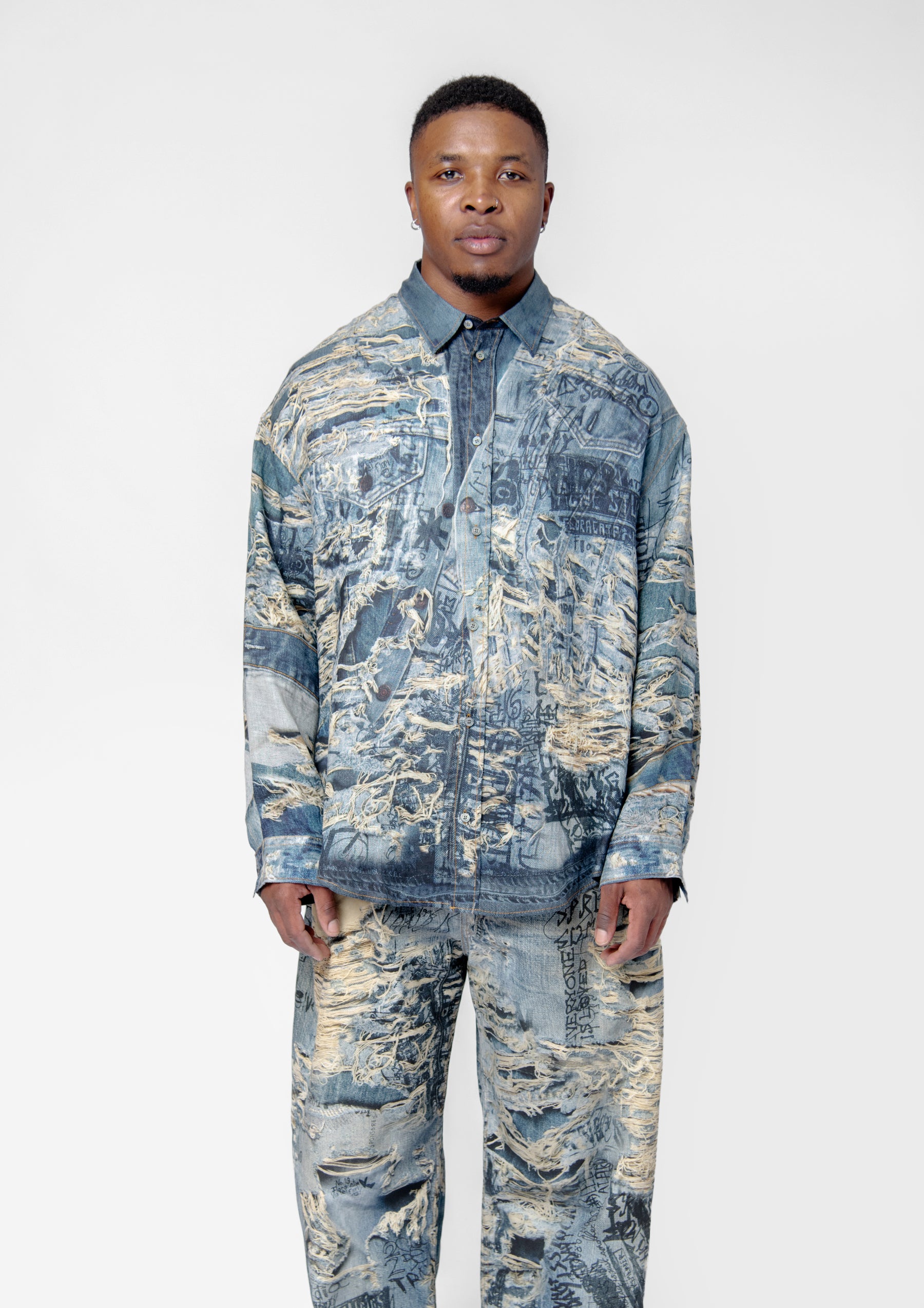 - Trompe l'oeil distressed denim print throughout