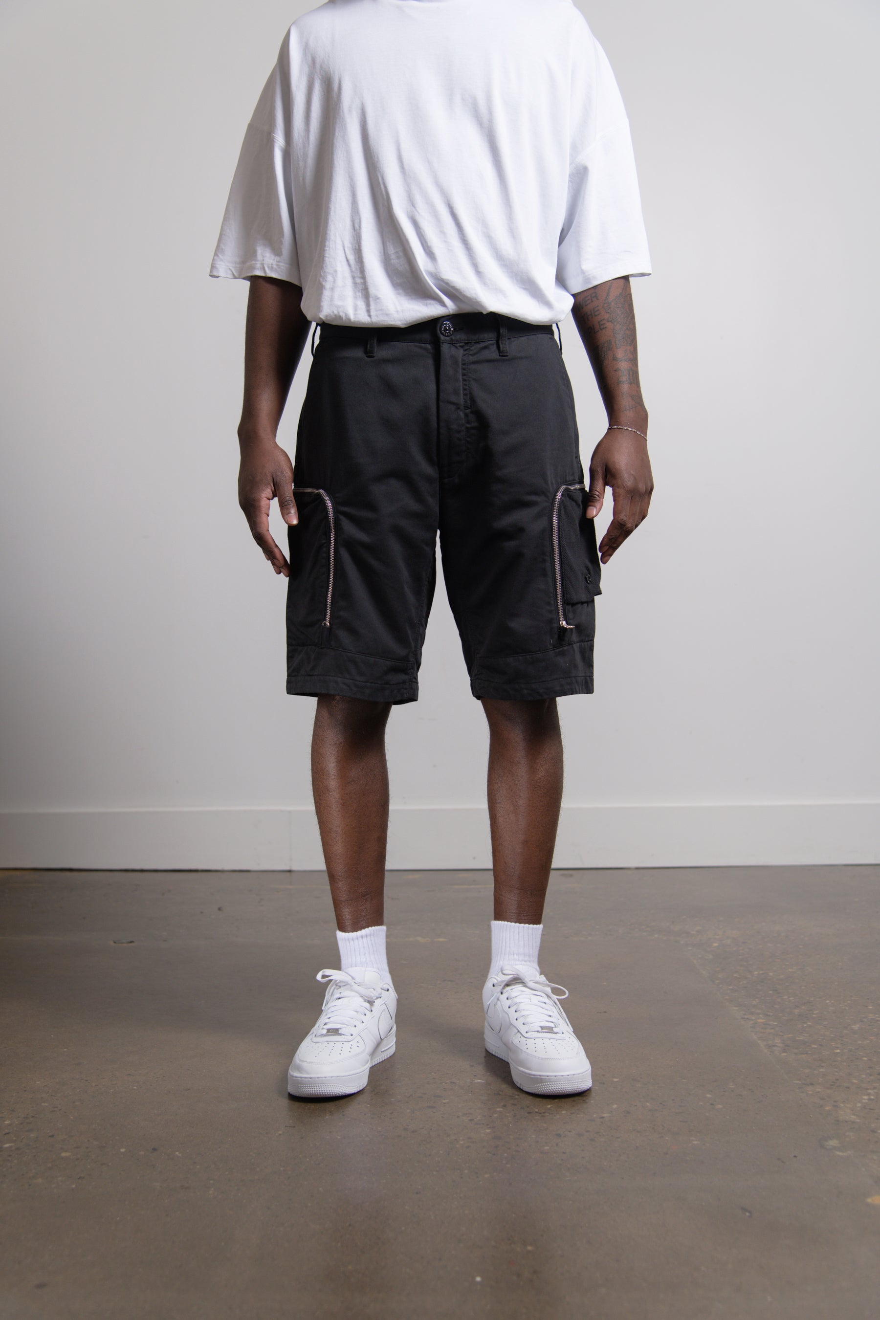 - Patch pocket with round L-shaped two-way zip closure at each leg