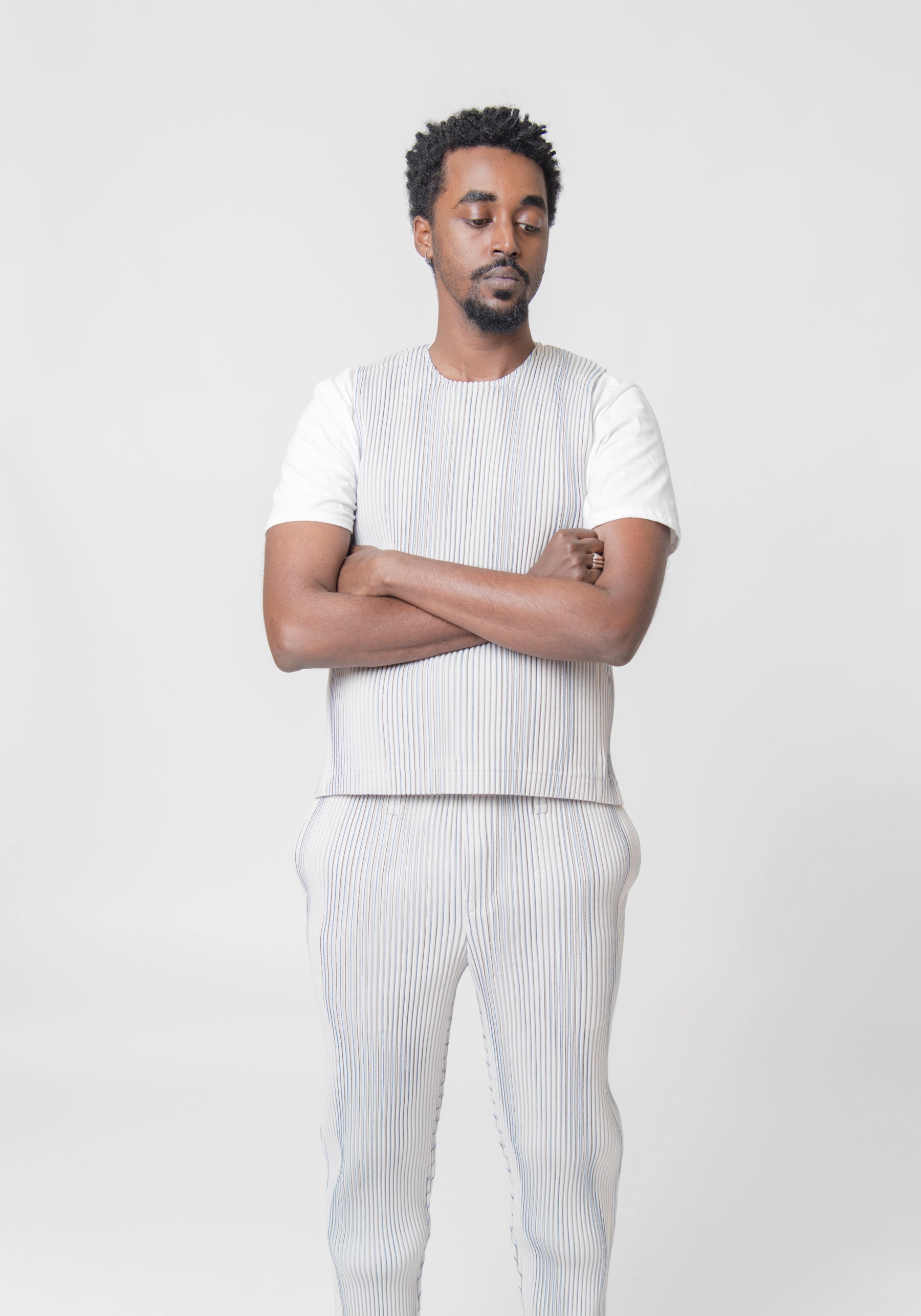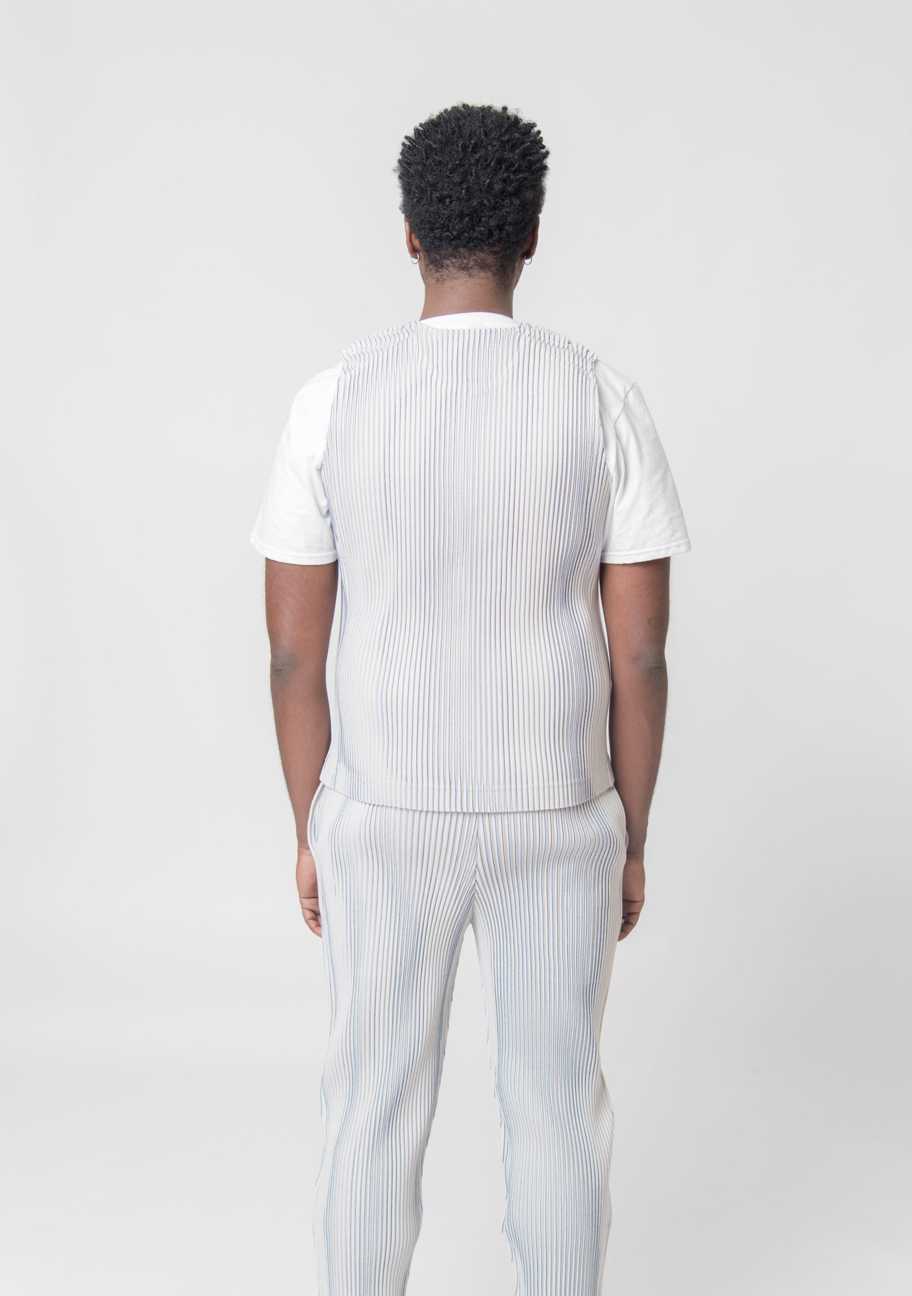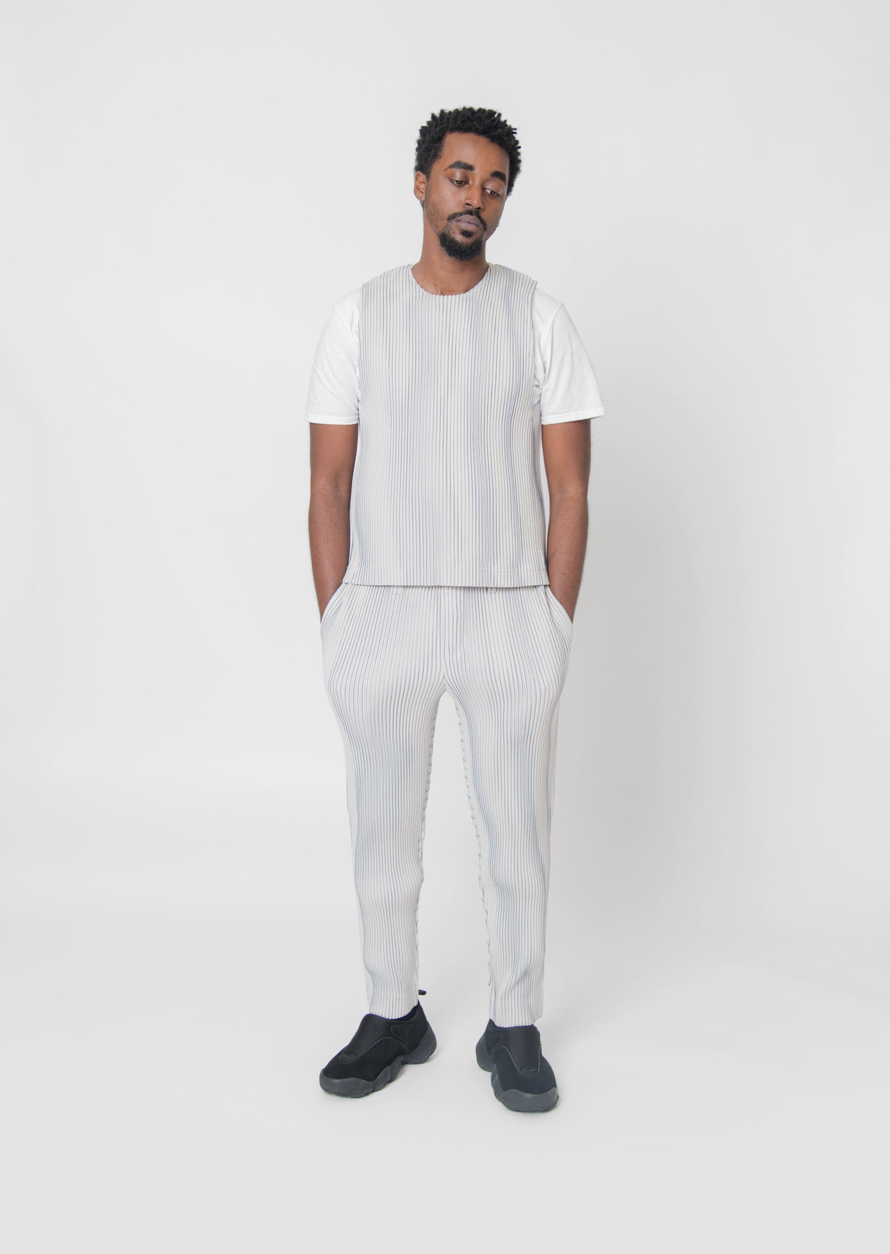 - Homme Plisse long-sleeve tweed pleated vest in Ivory